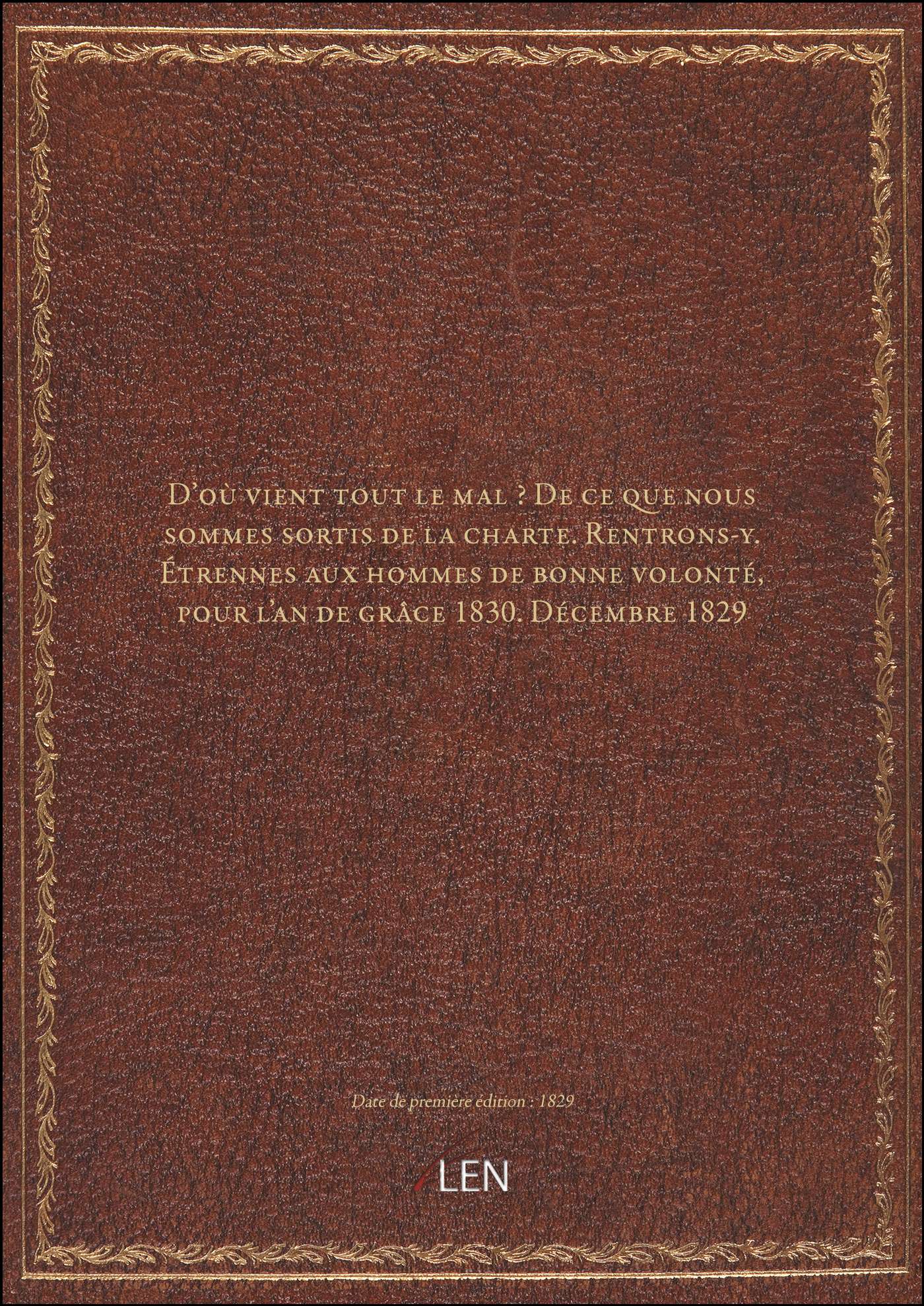 Titre complet : D'où vient tout le mal ? De ce que nous sommes sortis de la charte . Rentrons-y. Étrennes aux hommes de bonne volonté, pour l'an de grâce 1830. Décembre 1829