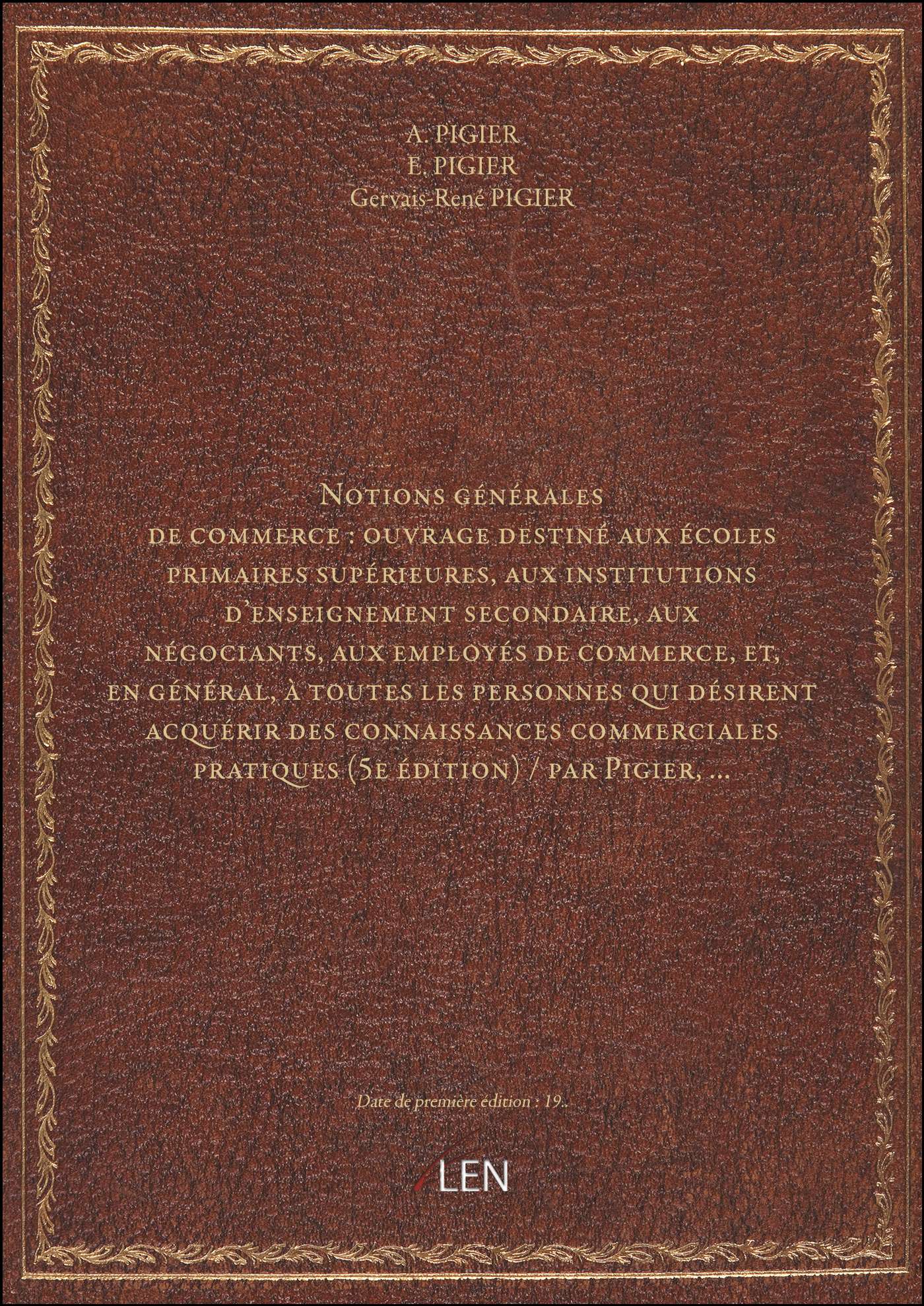 Titre complet : Notions générales de commerce : ouvrage destiné aux écoles primaires supérieures, aux institutions d'enseignement secondaire, aux négociants, aux employés de commerce, et, en général, à toutes les personnes qui désirent acquérir des connaissances commerciales pratiques (5e édition) / par Pigier,...