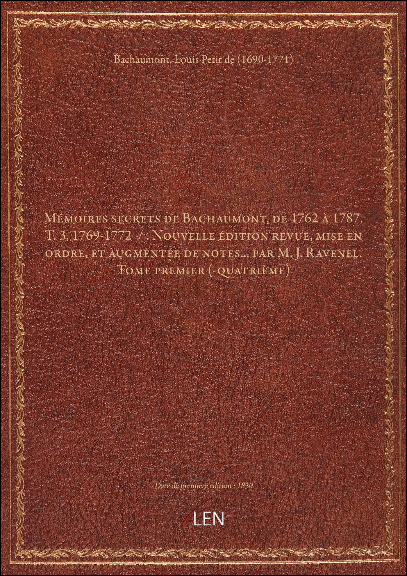 Titre complet : Mémoires secrets. Tome 3 / de Bachaumont (édités et continués par Pidansat de Mairobert et Moufle d'Angerville), de 1762 à 1787. Nouvelle édition revue, mise en ordre, et augmentée de notes... par M. J. Ravenel. Tome premier (-quatrième) 1762 (-1774)