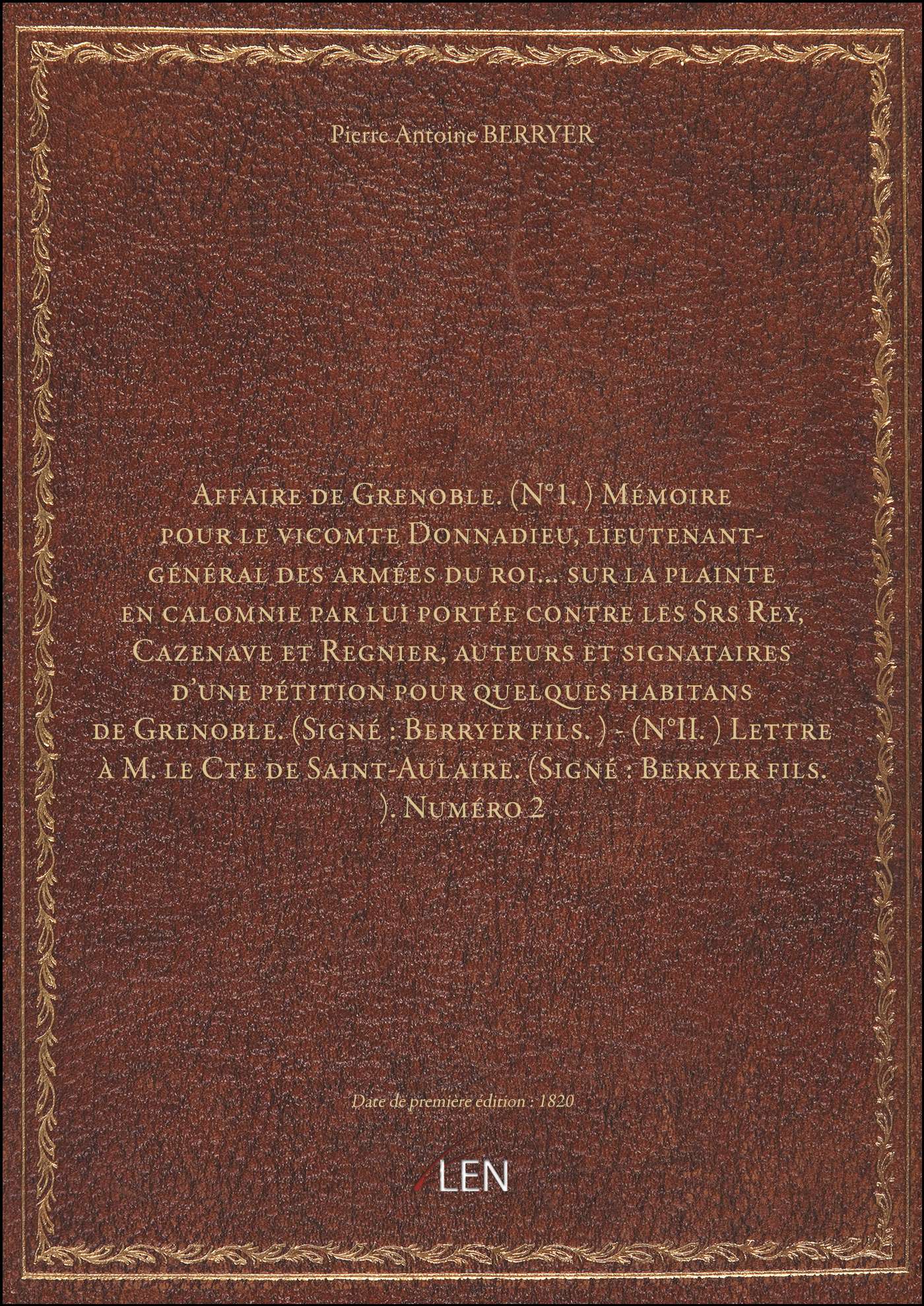 Titre complet : Affaire de Grenoble. (N°1.) Mémoire pour le vicomte Donnadieu, lieutenant-général des armées du roi... sur la plainte en calomnie par lui portée contre les Srs Rey, Cazenave et Regnier, auteurs et signataires d'une pétition pour quelques habitans de Grenoble. (Signé : Berryer fils.) - (N°II.) Lettre à M. le Cte de Saint-Aulaire. (Signé : Berryer fils.). Numéro 2
