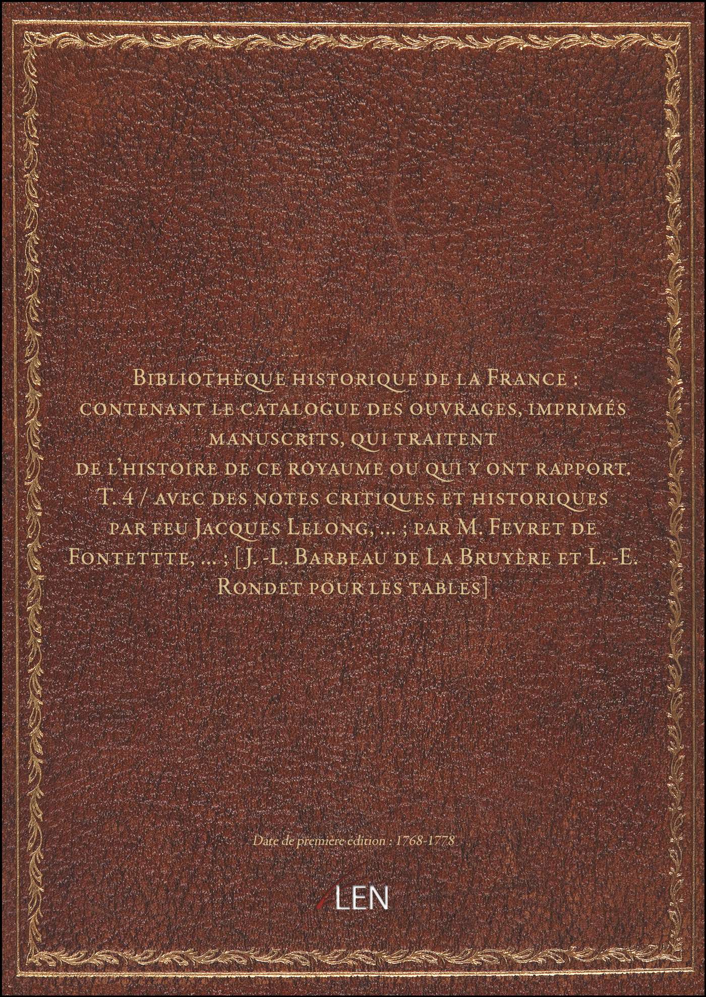 Titre complet : Bibliothèque historique de la France : contenant le catalogue des ouvrages, imprimés manuscrits, qui traitent de l'histoire de ce royaume ou qui y ont rapport. T. 4 / avec des notes critiques et historiques par feu Jacques Lelong,... ; par M. Fevret de Fontettte,... ; [J.-L. Barbeau de La Bruyère et L.-E. Rondet pour les tables]