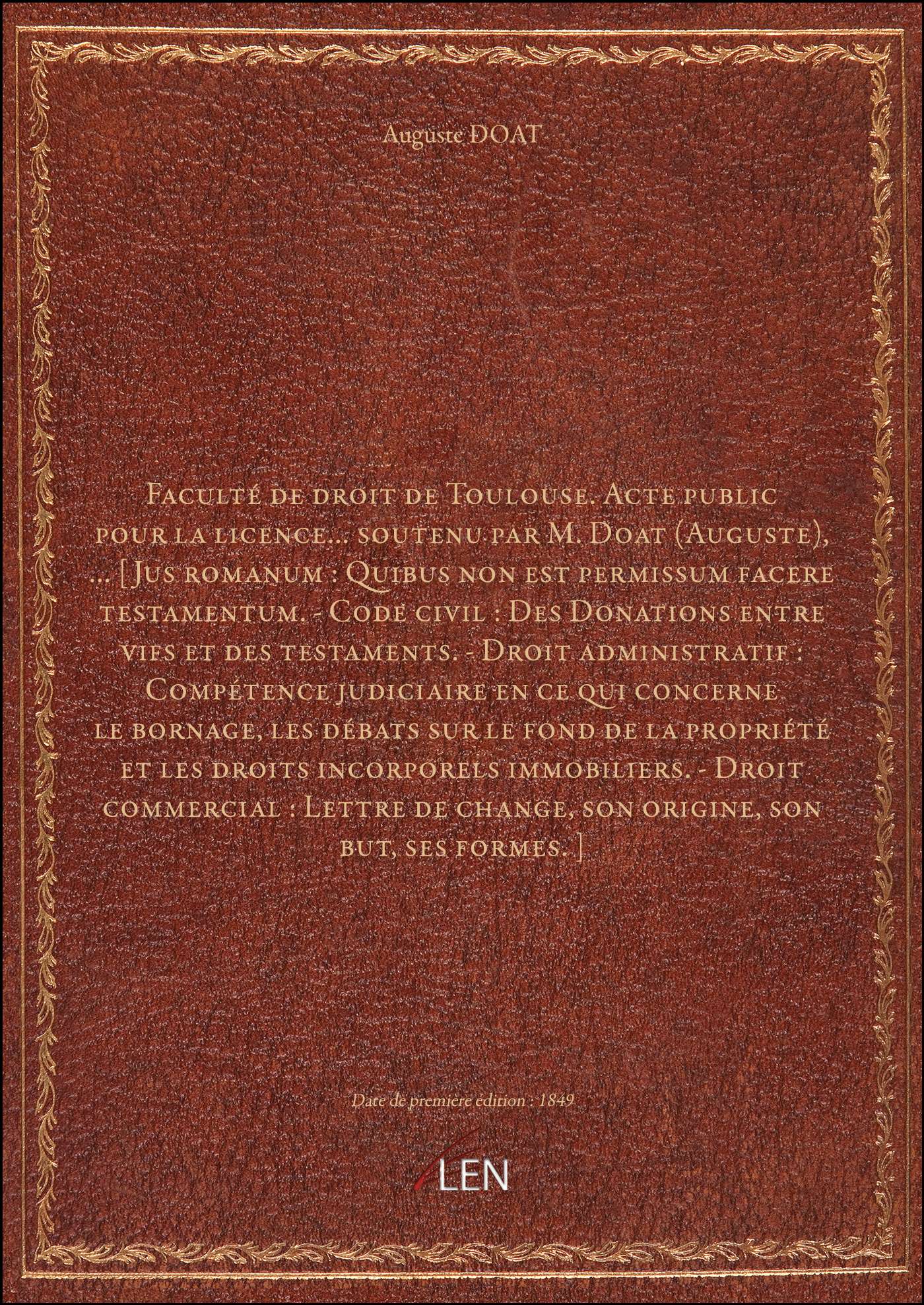 Titre complet : Faculté de droit de Toulouse. Acte public pour la licence... soutenu par M. Doat (Auguste),... [Jus romanum : Quibus non est permissum facere testamentum. - Code civil : Des Donations entre vifs et des testaments. - Droit administratif : Compétence judiciaire en ce qui concerne le bornage, les débats sur le fond de la propriété et les droits incorporels immobiliers. - Droit commercial : Lettre de change, son origine, son but, ses formes.]