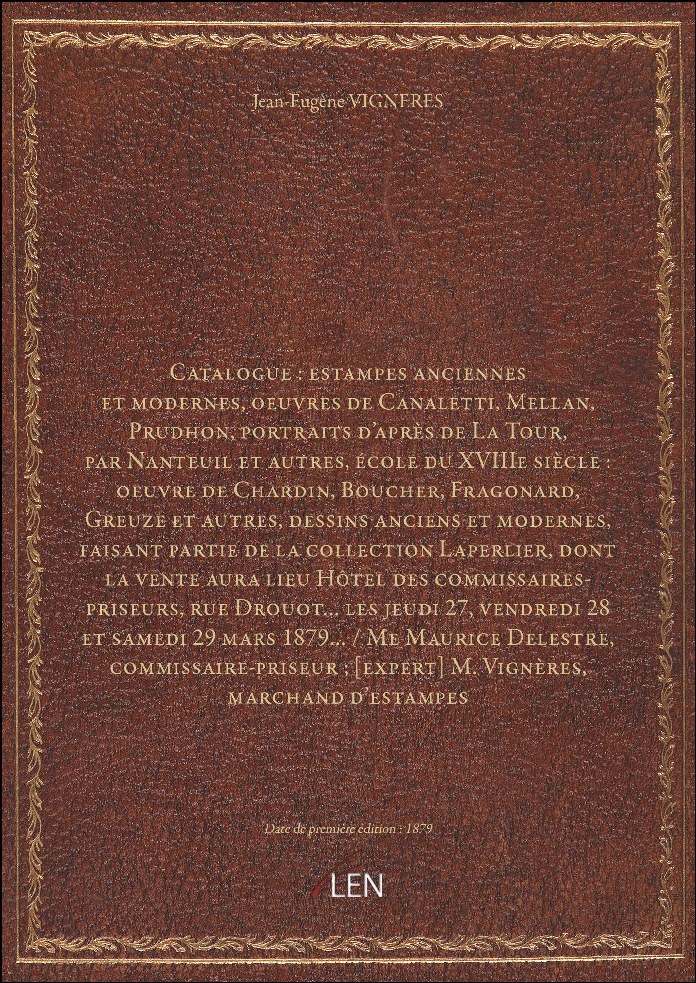 Titre complet : Catalogue : estampes anciennes et modernes, oeuvres de Canaletti, Mellan, Prudhon, portraits d'après de La Tour, par Nanteuil et autres, école du XVIIIe siècle : oeuvre de Chardin, Boucher, Fragonard, Greuze et autres, dessins anciens et modernes, faisant partie de la collection Laperlier, dont la vente aura lieu Hôtel des commissaires-priseurs, rue Drouot... les jeudi 27, vendredi 28 et samedi 29 mars 1879... / Me Maurice Delestre, commissaire-priseur ; [expert] M. Vignères, marchand d'estampes