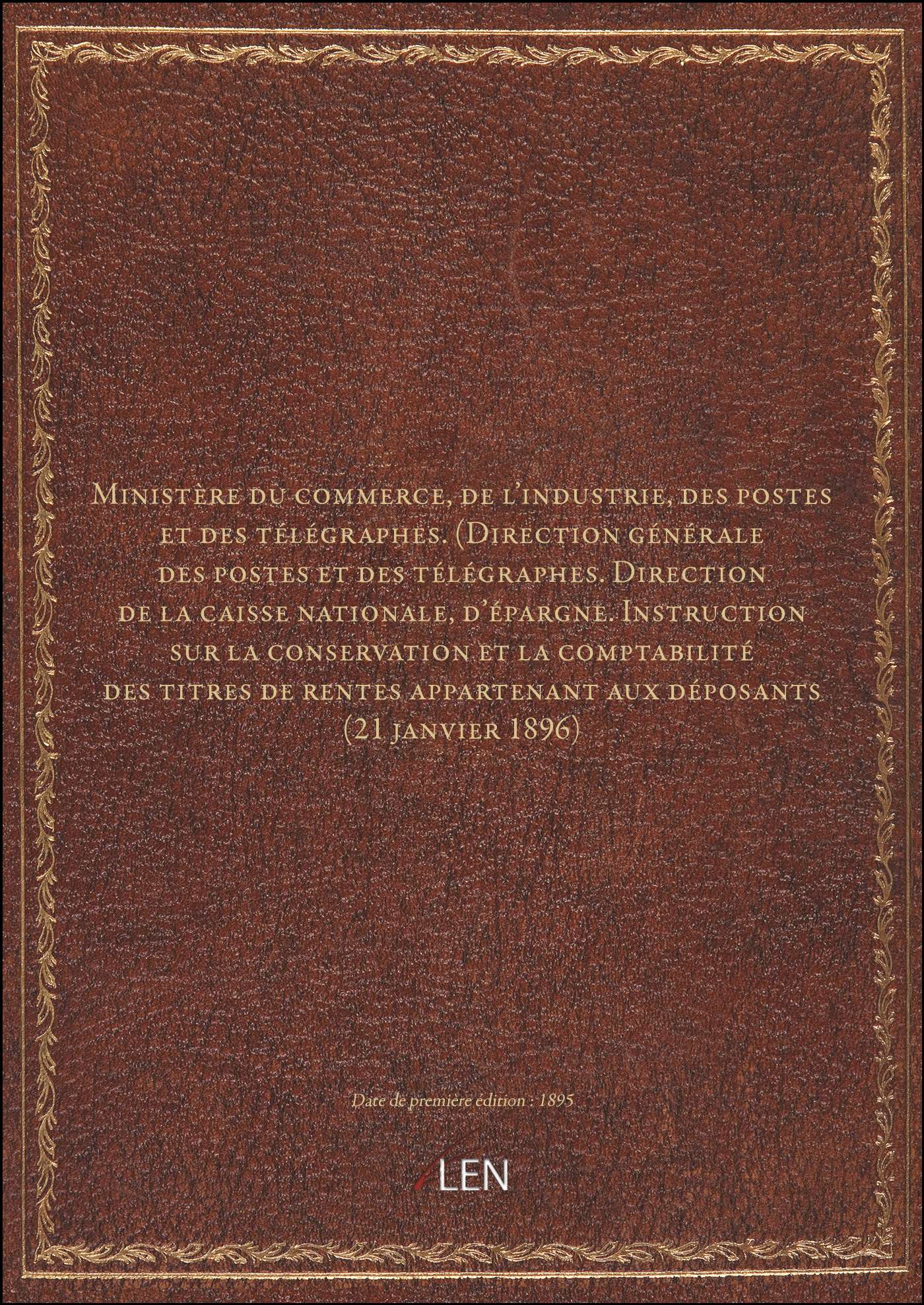 Titre complet : Ministère du commerce, de l'industrie, des postes et des télégraphes. (Direction générale des postes et des télégraphes. Direction de la caisse nationale, d'épargne. Instruction sur la conservation et la comptabilité des titres de rentes appartenant aux déposants (21 janvier 1896)