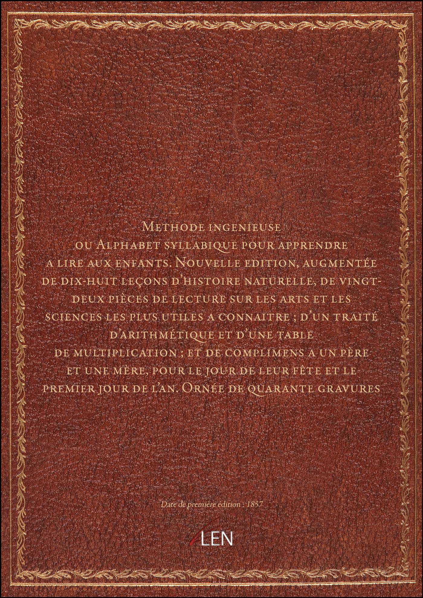 Titre complet : Methode ingenieuse ou Alphabet syllabique pour apprendre a lire aux enfants . Nouvelle edition, augmentée de dix-huit leçons d'histoire naturelle, de vingt-deux pièces de lecture sur les arts et les sciences les plus utiles a connaitre ; d'un traité d'arithmétique et d'une table de multiplication ; et de complimens a un père et une mère, pour le jour de leur fête et le premier jour de l'an. Ornée de quarante gravures