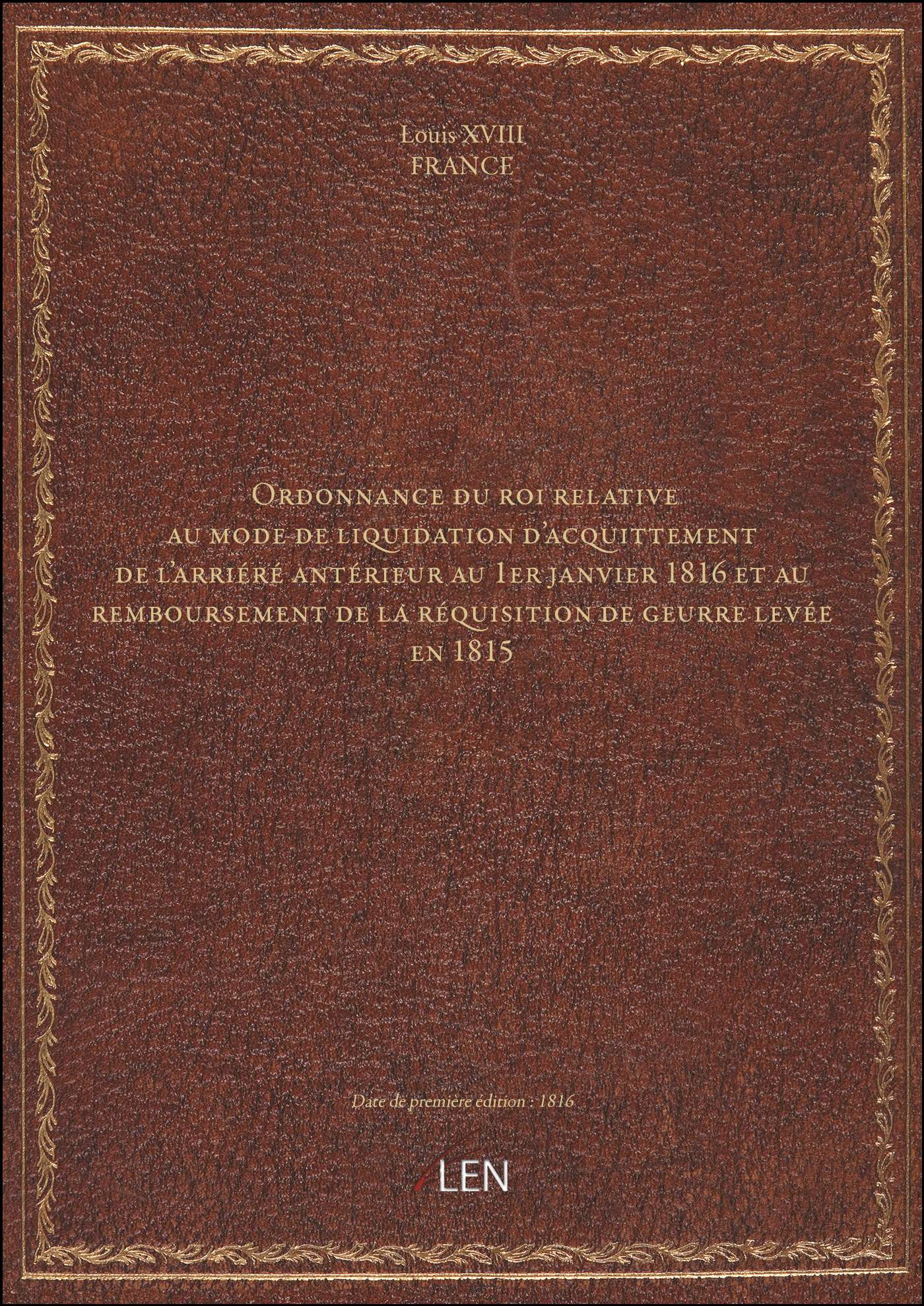 Titre complet : Ordonnance du roi relative au mode de liquidation d'acquittement de l'arriéré antérieur au 1er janvier 1816 et au remboursement de la réquisition de geurre levée en 1815