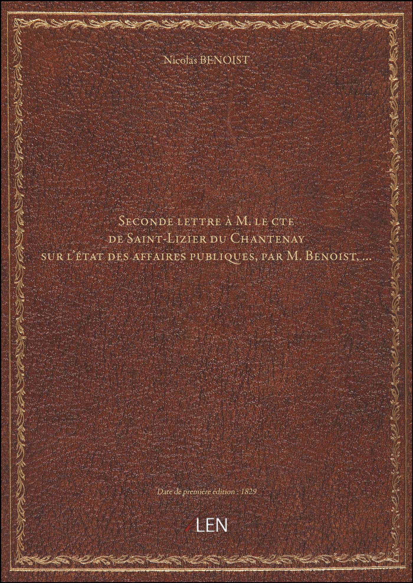 Titre complet : Seconde lettre à M. le cte de Saint-Lizier du Chantenay sur l'état des affaires publiques , par M. Benoist,...