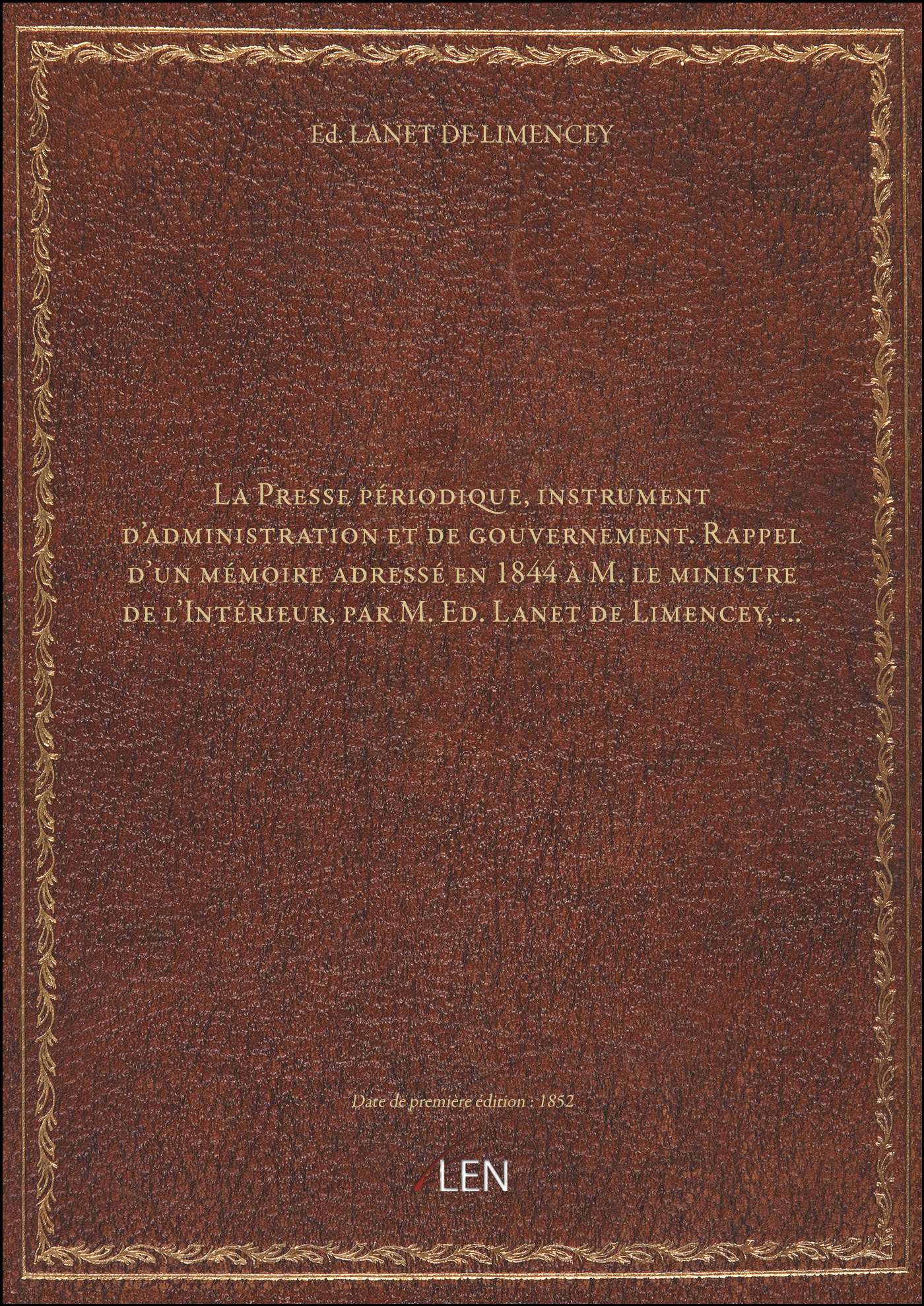 Titre complet : La Presse périodique, instrument d'administration et de gouvernement. Rappel d'un mémoire adressé en 1844 à M. le ministre de l'Intérieur, par M. Ed. Lanet de Limencey,...