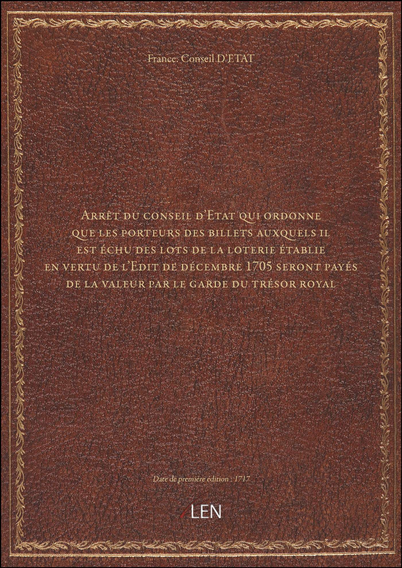 Titre complet : Arrêt du conseil d'Etat qui ordonne que les porteurs des billets auxquels il est échu des lots de la loterie établie en vertu de l'Edit de décembre 1705 seront payés de la valeur par le garde du trésor royal
