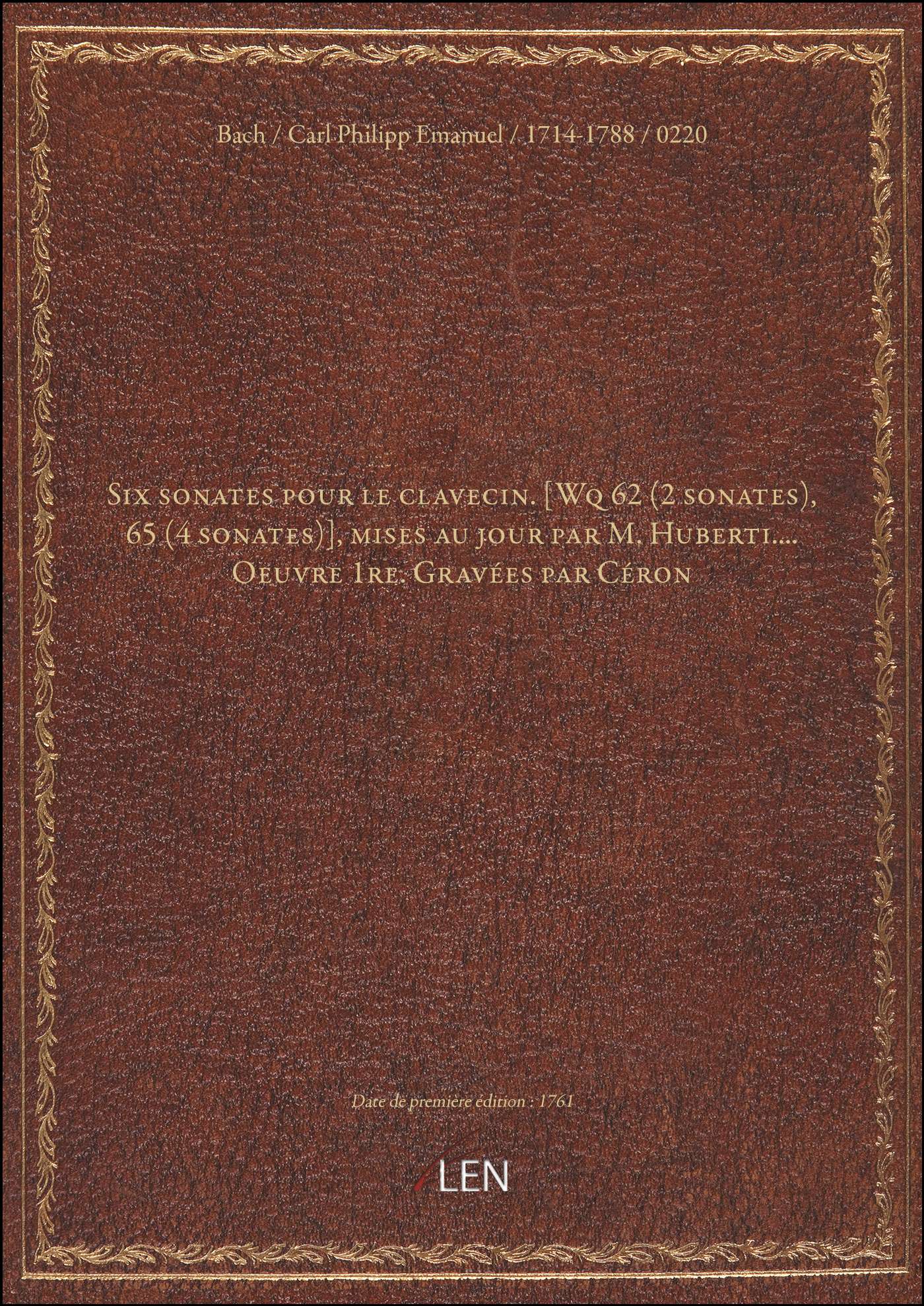 Titre complet : Six sonates pour le clavecin. [Wq 62 (2 sonates), 65 (4 sonates)], mises au jour par M. Huberti.... Oeuvre 1re. Gravées par Céron