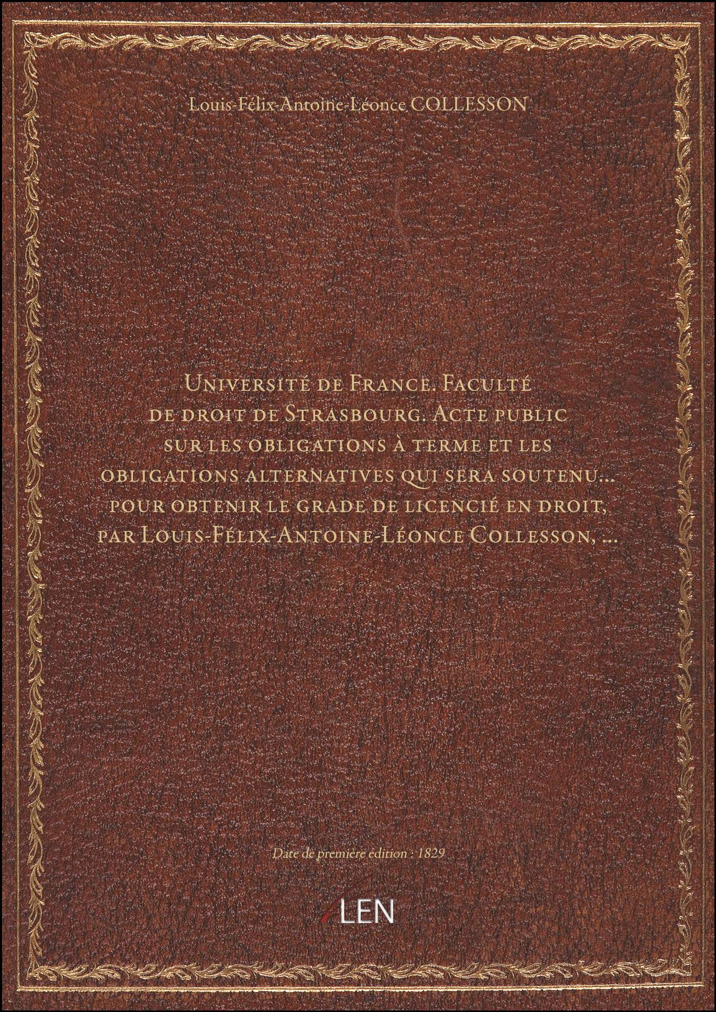 Université de France. Faculté de droit de Strasbourg. Acte public sur les obligations à terme et les obligations alternatives qui sera soutenu... pour obtenir le grade de licencié en droit, par Louis-Félix-Antoine-Léonce Collesson,...