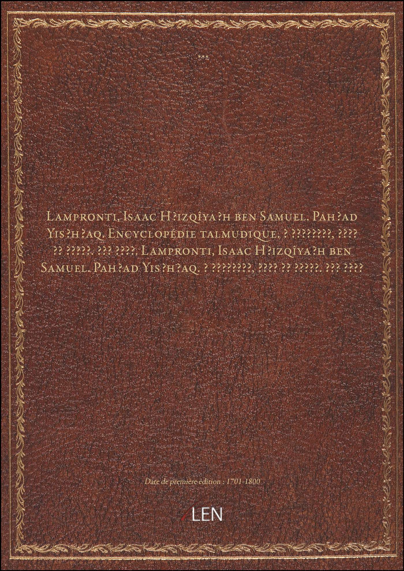 Titre complet : Lampronti, Isaac H?izqîya?h ben Samuel. Pah?ad Yis?h?aq. Encyclopédie talmudique. ? ????????, ???? ?? ?????. ??? ????. Lampronti, Isaac H?izqîya?h ben Samuel. Pah?ad Yis?h?aq. ? ????????, ???? ?? ?????. ??? ????