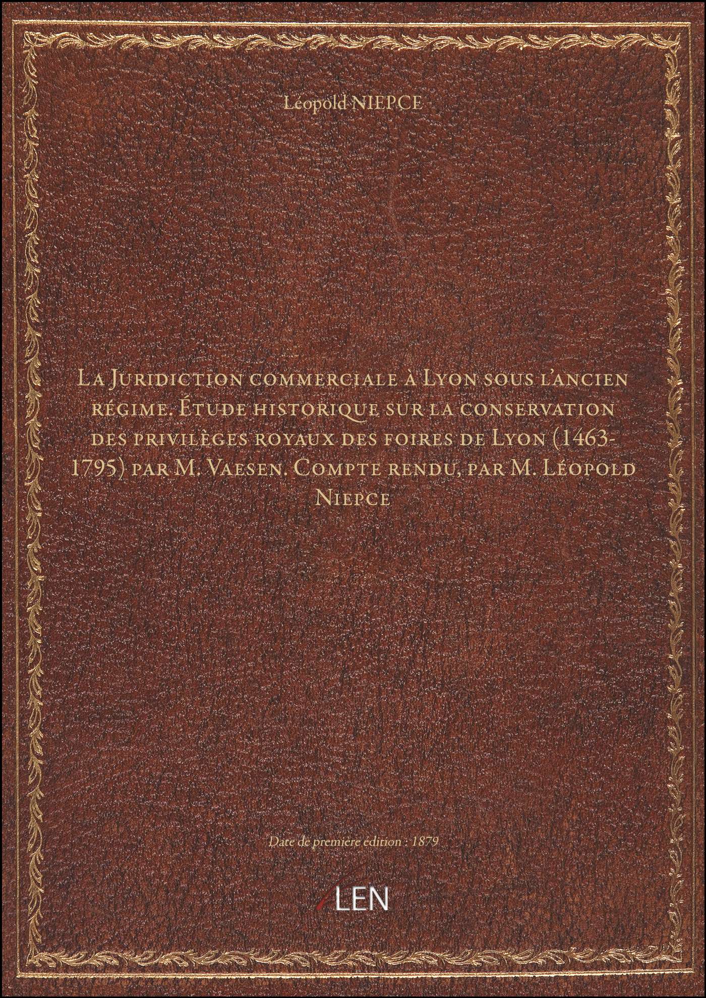 Titre complet : La Juridiction commerciale à Lyon sous l'ancien régime. Étude historique sur la conservation des privilèges royaux des foires de Lyon (1463-1795) par M. Vaesen. Compte rendu, par M. Léopold Niepce