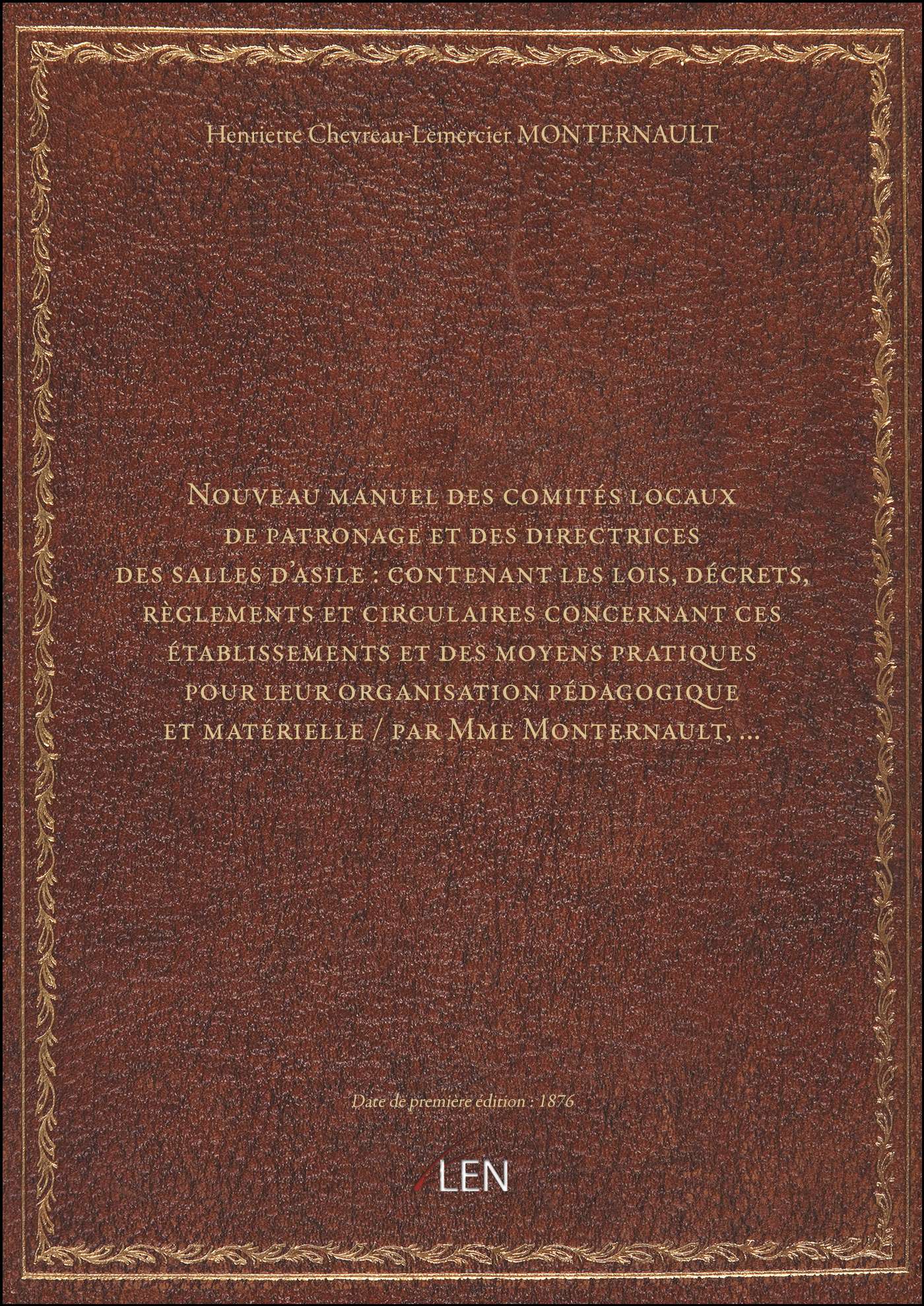 Titre complet : Nouveau manuel des comités locaux de patronage et des directrices des salles d'asile : contenant les lois, décrets, règlements et circulaires concernant ces établissements et des moyens pratiques pour leur organisation pédagogique et matérielle / par Mme Monternault,...