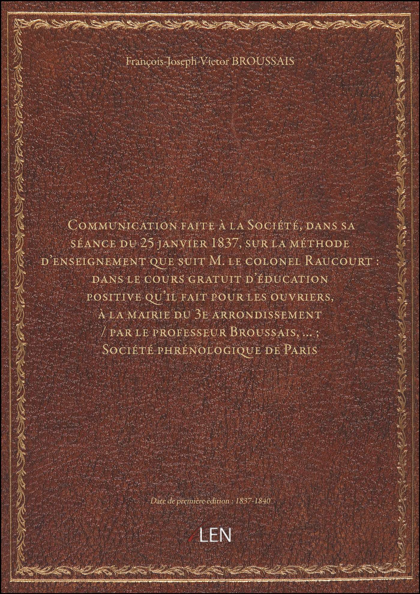 Titre complet : Communication faite à la Société, dans sa séance du 25 janvier 1837, sur la méthode d'enseignement que suit M. le colonel Raucourt : dans le cours gratuit d'éducation positive qu'il fait pour les ouvriers, à la mairie du 3e arrondissement / par le professeur Broussais,... ; Société phrénologique de Paris