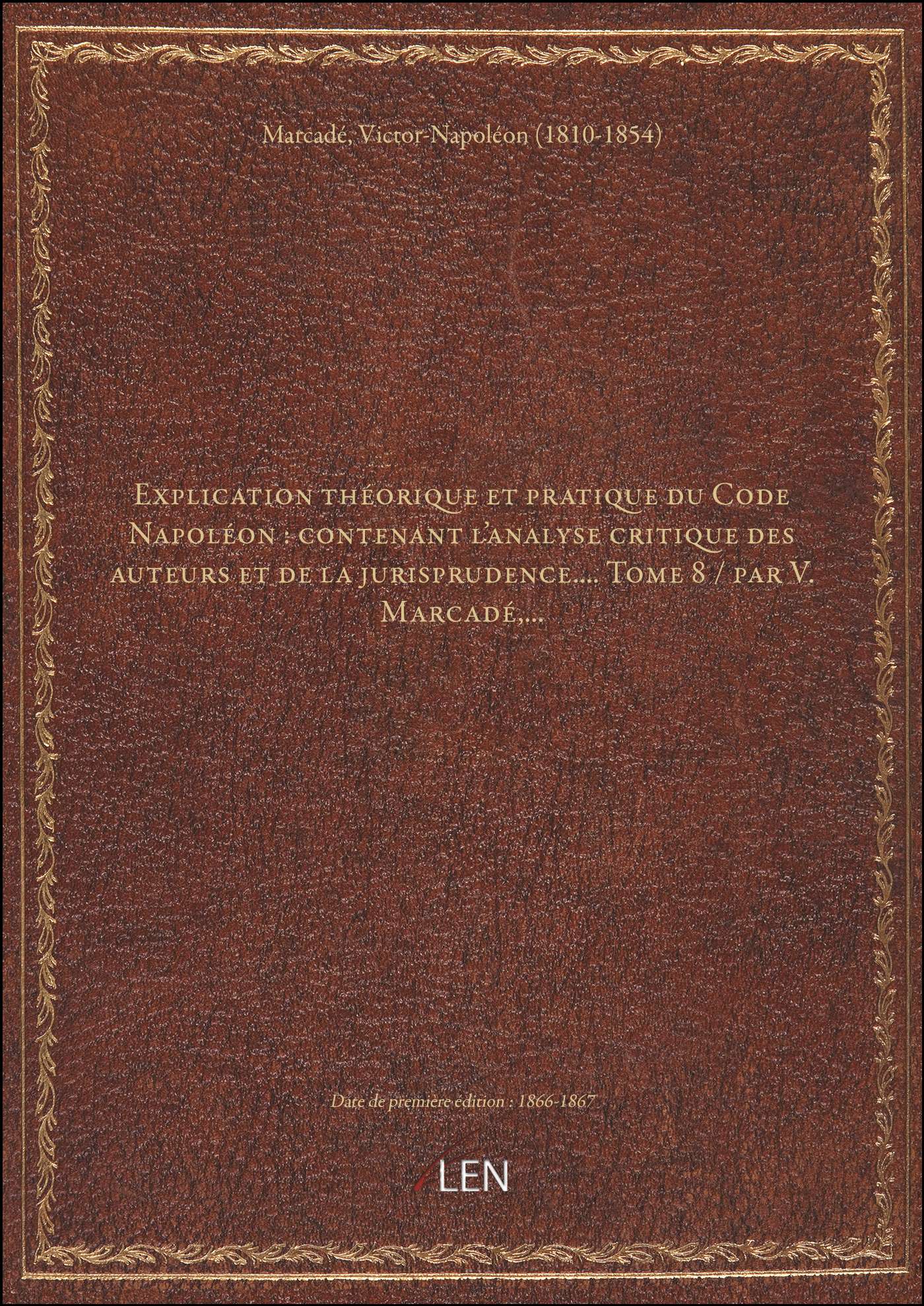 Titre complet : Explication théorique et pratique du Code Napoléon : contenant l'analyse critique des auteurs et de la jurisprudence.... Tome 8 / par V. Marcadé,...