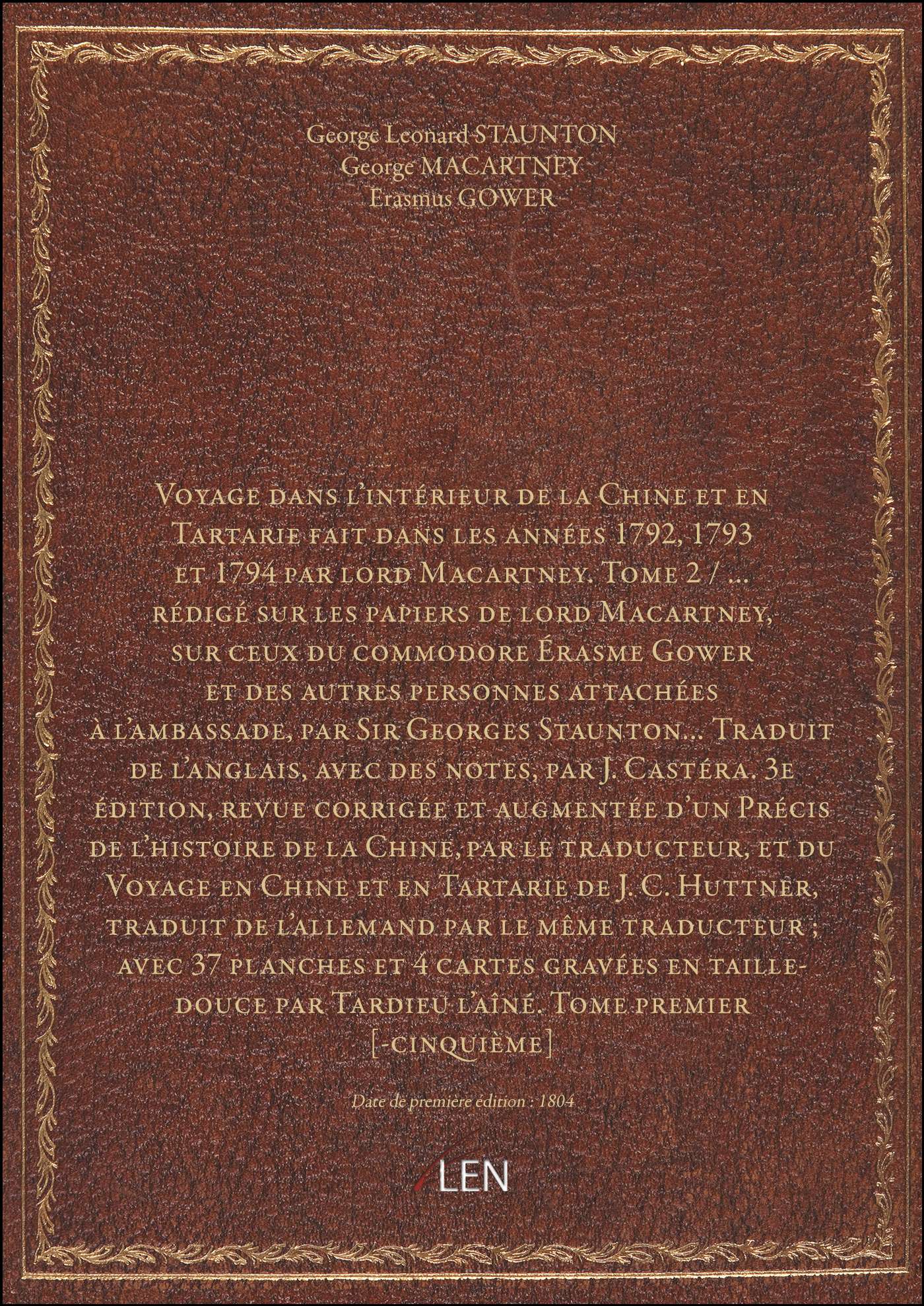 Titre complet : Voyage dans l'intérieur de la Chine et en Tartarie fait dans les années 1792, 1793 et 1794 par lord Macartney. Tome 2 / ... rédigé sur les papiers de lord Macartney, sur ceux du commodore Érasme Gower et des autres personnes attachées à l'ambassade, par Sir Georges Staunton... Traduit de l'anglais, avec des notes, par J. Castéra. 3e édition, revue corrigée et augmentée d'un Précis de l'histoire de la Chine, par le traducteur, et du Voyage en Chine et en Tartarie de J. C. Huttner, traduit de l'allemand par le même traducteur ; avec 37 planches et 4 cartes gravées en taille-douce par Tardieu l'aîné. Tome premier [-cinquième]