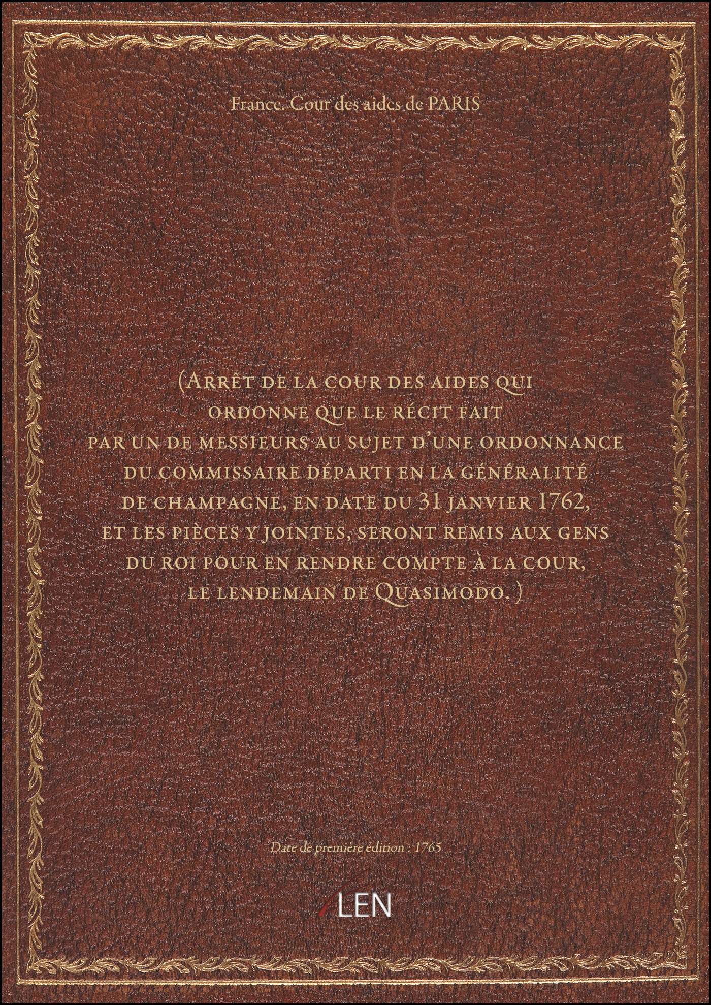 Titre complet : (Arrêt de la cour des aides qui ordonne que le récit fait par un de messieurs au sujet d'une ordonnance du commissaire départi en la généralité de champagne, en date du 31 janvier 1762, et les pièces y jointes, seront remis aux gens du roi pour en rendre compte à la cour, le lendemain de Quasimodo.)