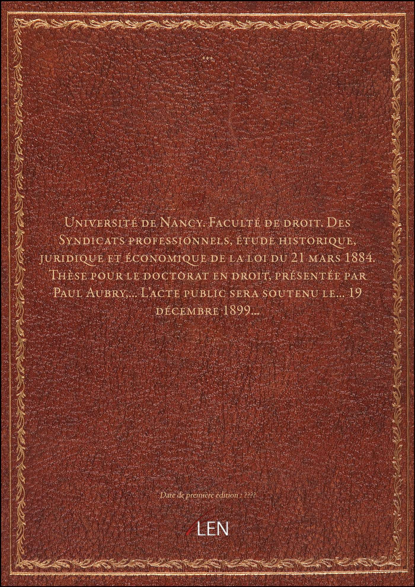 Titre complet : Université de Nancy. Faculté de droit. Des Syndicats professionnels, étude historique, juridique et économique de la loi du 21 mars 1884. Thèse pour le doctorat en droit, présentée par Paul Aubry,... L'acte public sera soutenu le... 19 décembre 1899...