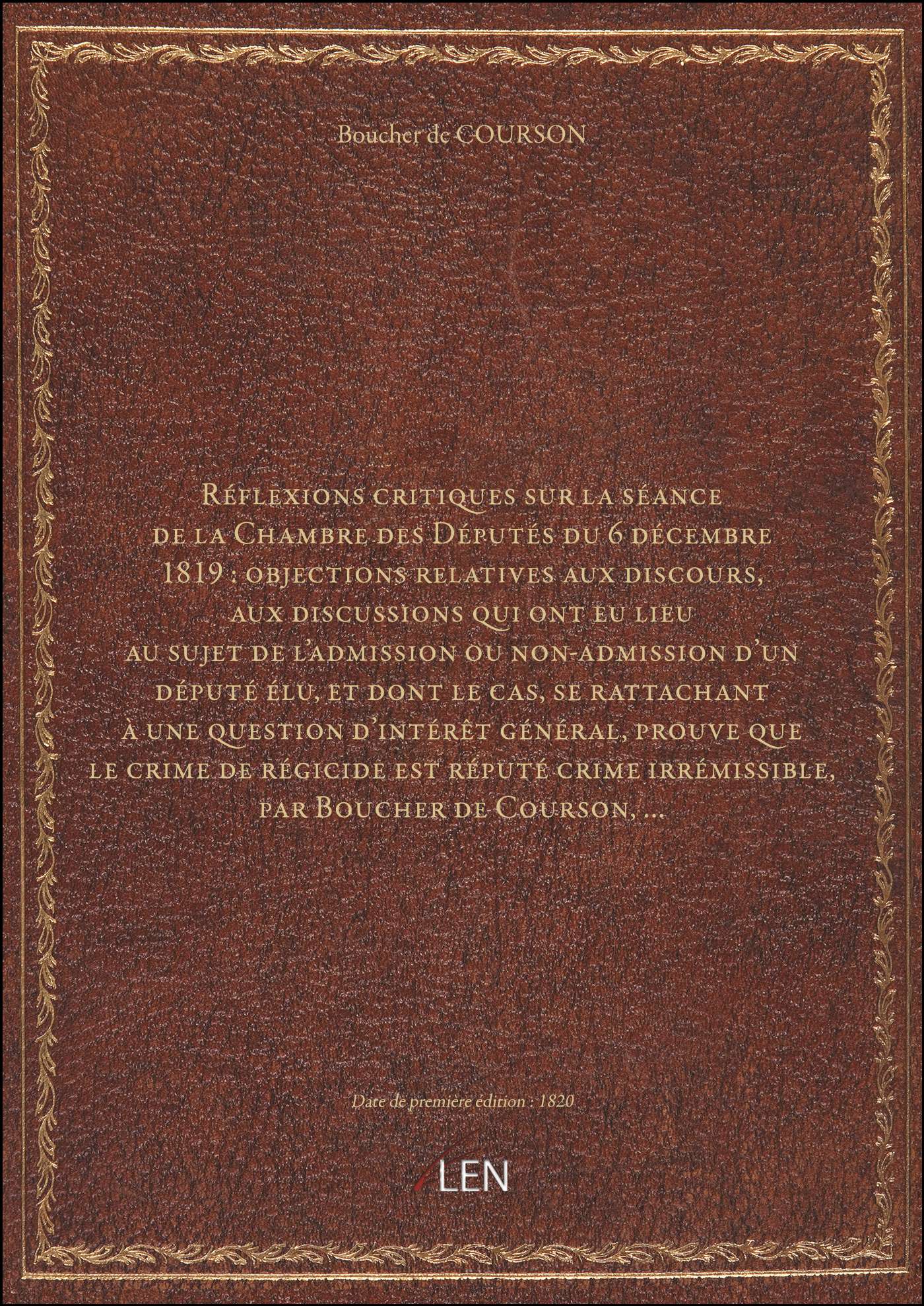 Titre complet : Réflexions critiques sur la séance de la Chambre des Députés du 6 décembre 1819 : objections relatives aux discours, aux discussions qui ont eu lieu au sujet de l'admission ou non-admission d'un député élu, et dont le cas, se rattachant à une question d'intérêt général, prouve que le crime de régicide est réputé crime irrémissible, par Boucher de Courson,...