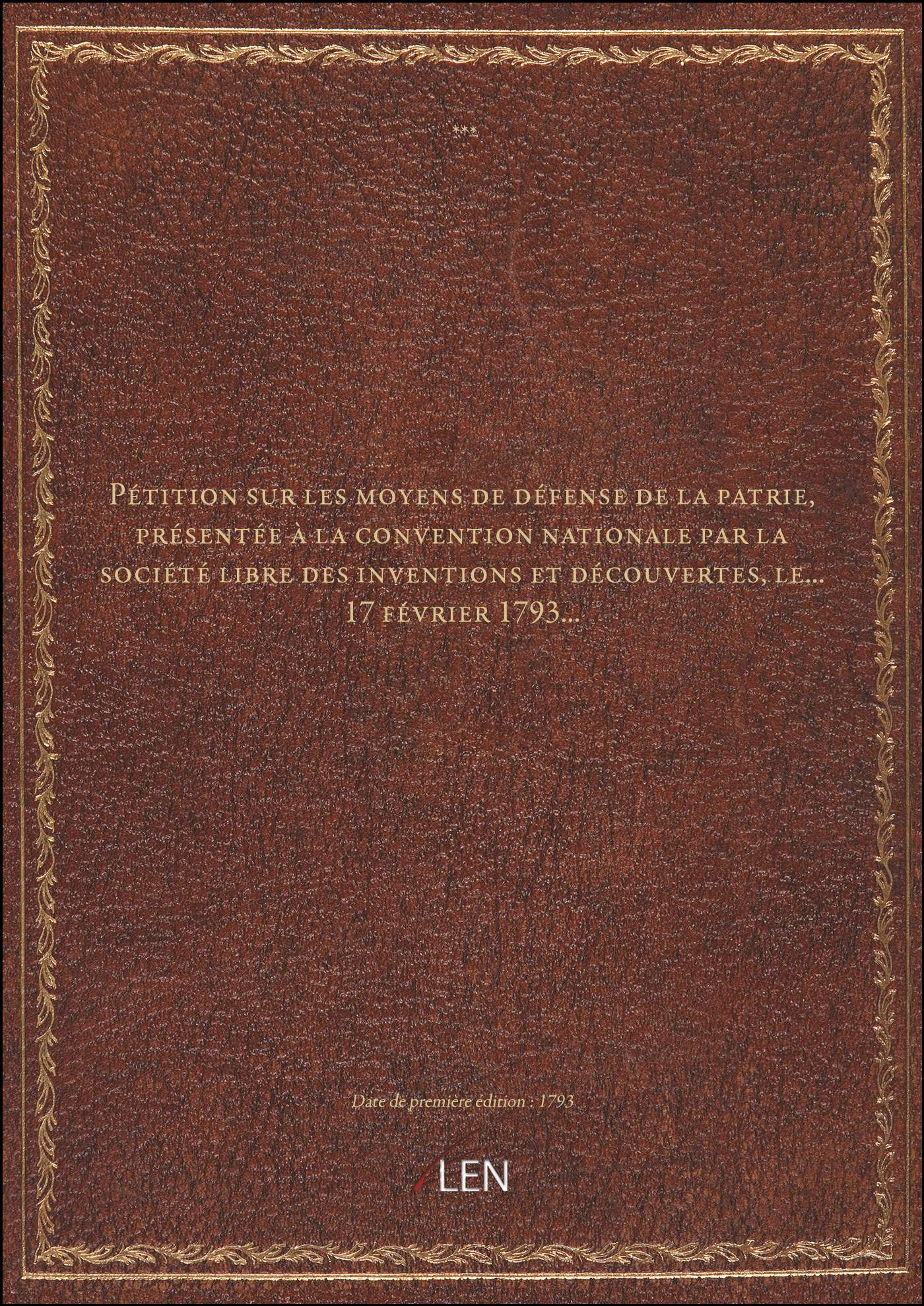 Titre complet : Pétition sur les moyens de défense de la patrie, présentée à la convention nationale par la société libre des inventions et découvertes, le... 17 février 1793...