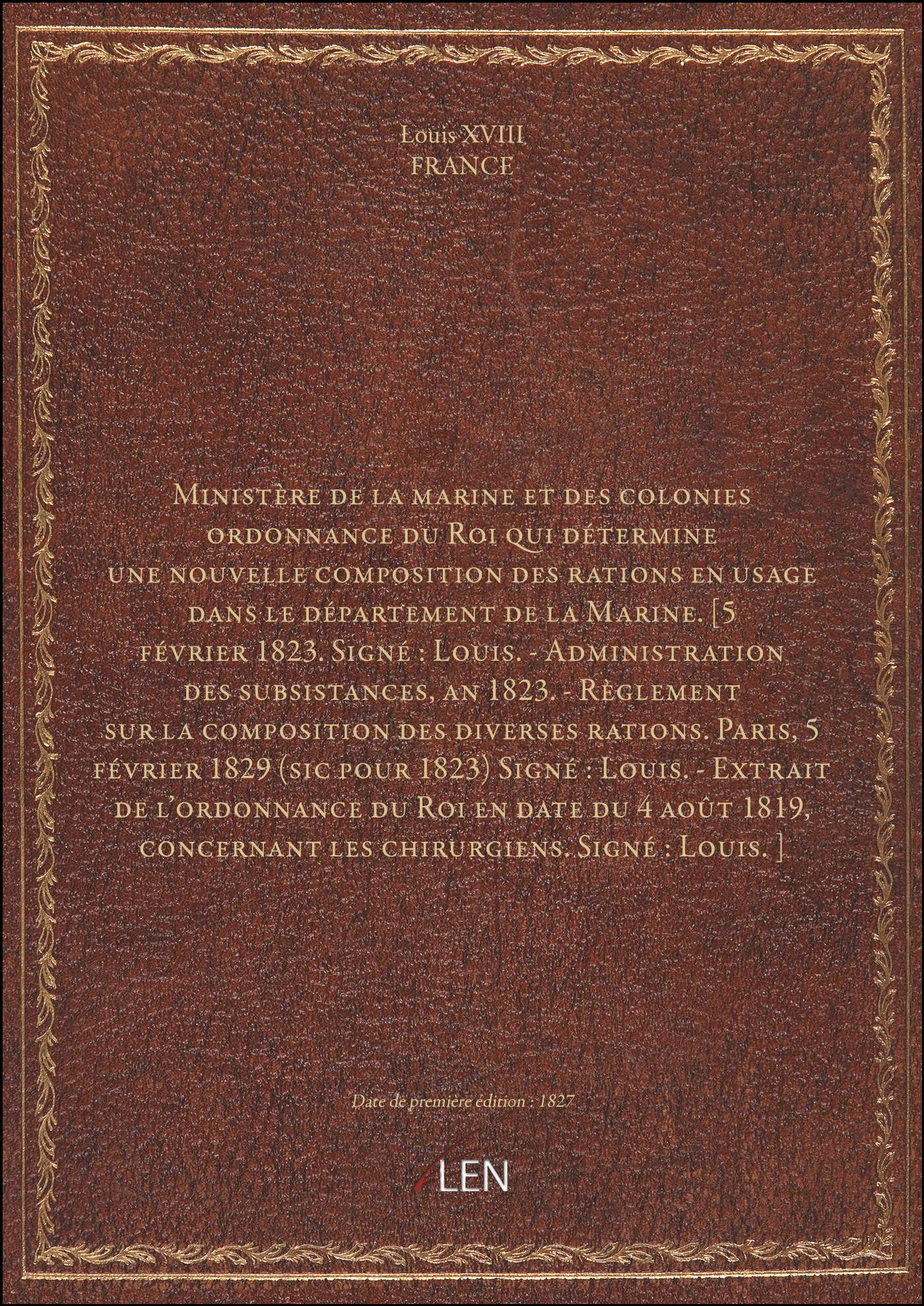 Titre complet : Ministère de la marine et des colonies ordonnance du Roi qui détermine une nouvelle composition des rations en usage dans le département de la Marine. [5 février 1823. Signé : Louis. - Administration des subsistances, an 1823. - Règlement sur la composition des diverses rations. Paris, 5 février 1829 (sic pour 1823) Signé : Louis. - Extrait de l'ordonnance du Roi en date du 4 août 1819, concernant les chirurgiens. Signé : Louis.]