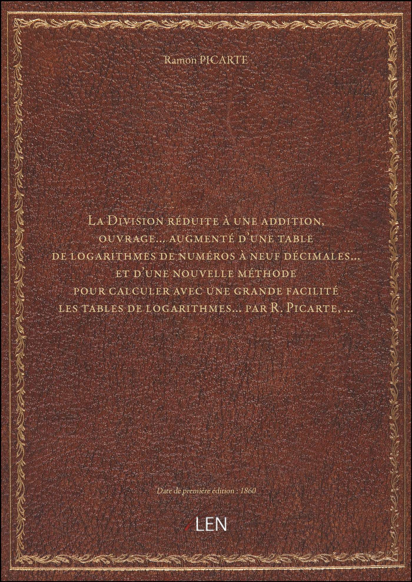 La Division réduite à une addition, ouvrage... augmenté d'une table de logarithmes de numéros à neuf décimales... et d'une nouvelle méthode pour calculer avec une grande facilité les tables de logarithmes... par R. Picarte,...