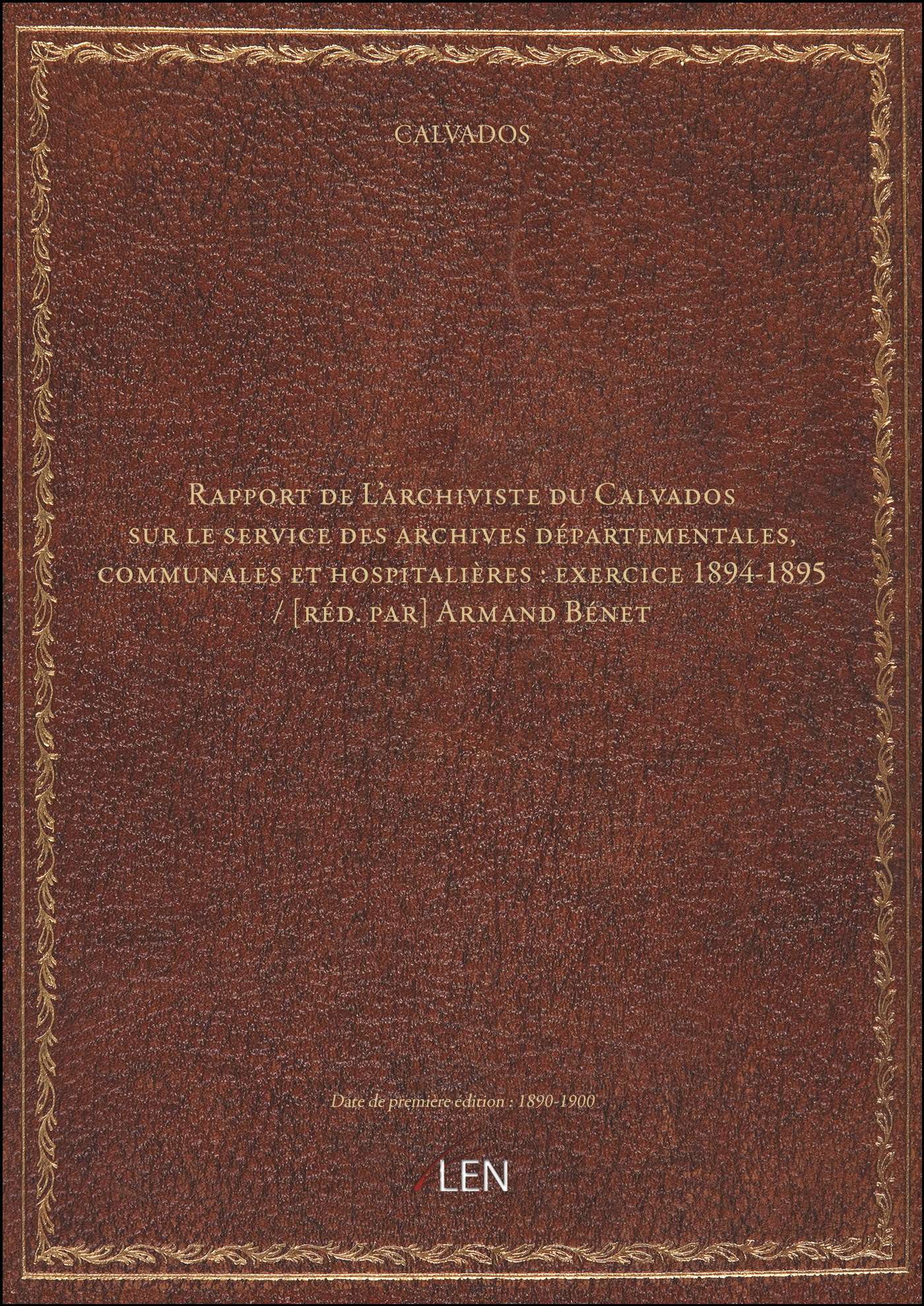 Titre complet : Rapport de L'archiviste du Calvados sur le service des archives départementales, communales et hospitalières : exercice 1894-1895 / [réd. par] Armand Bénet