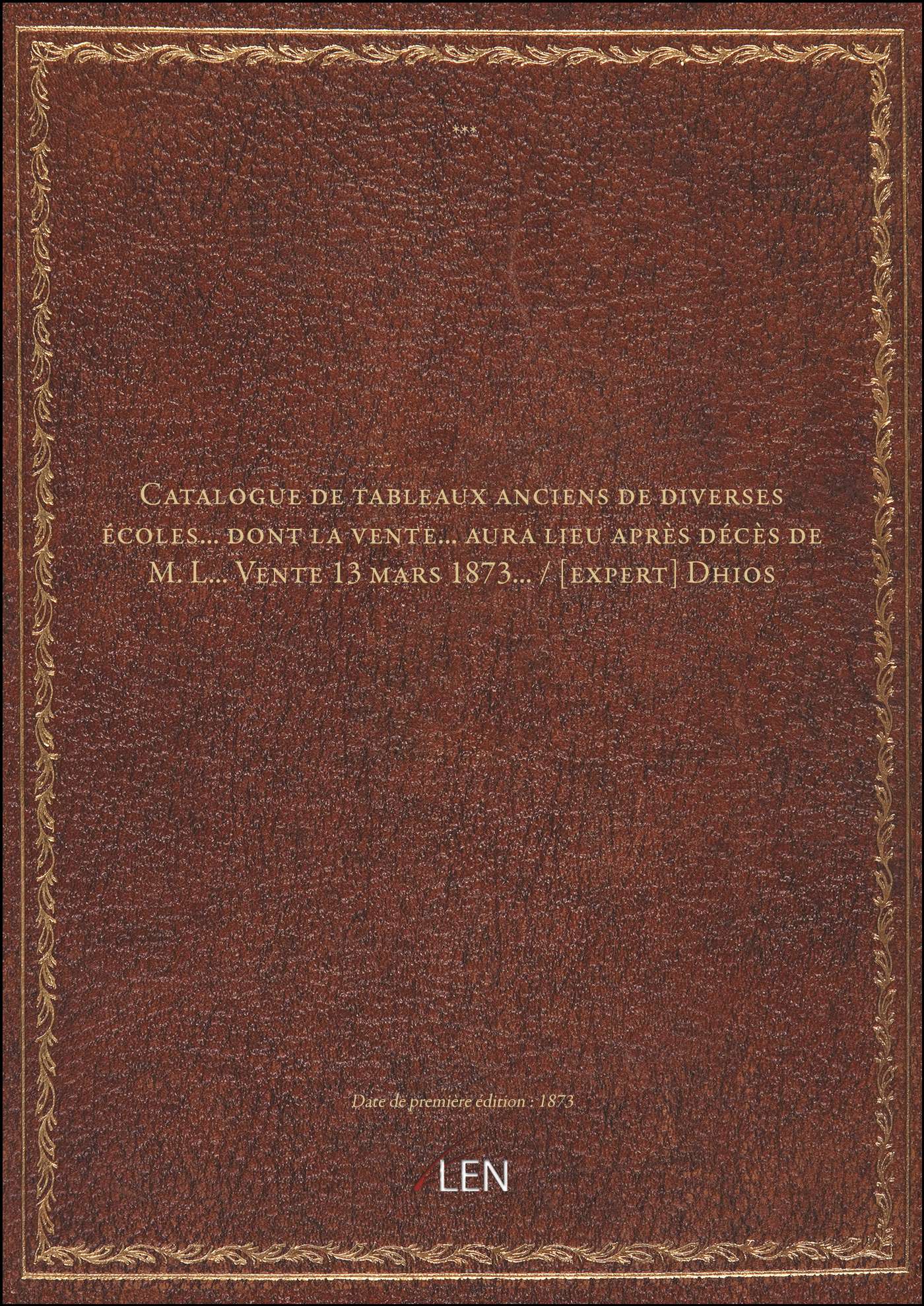 Titre complet : Catalogue de tableaux anciens de diverses écoles... dont la vente... aura lieu après décès de M. L... Vente 13 mars 1873... / [expert] Dhios