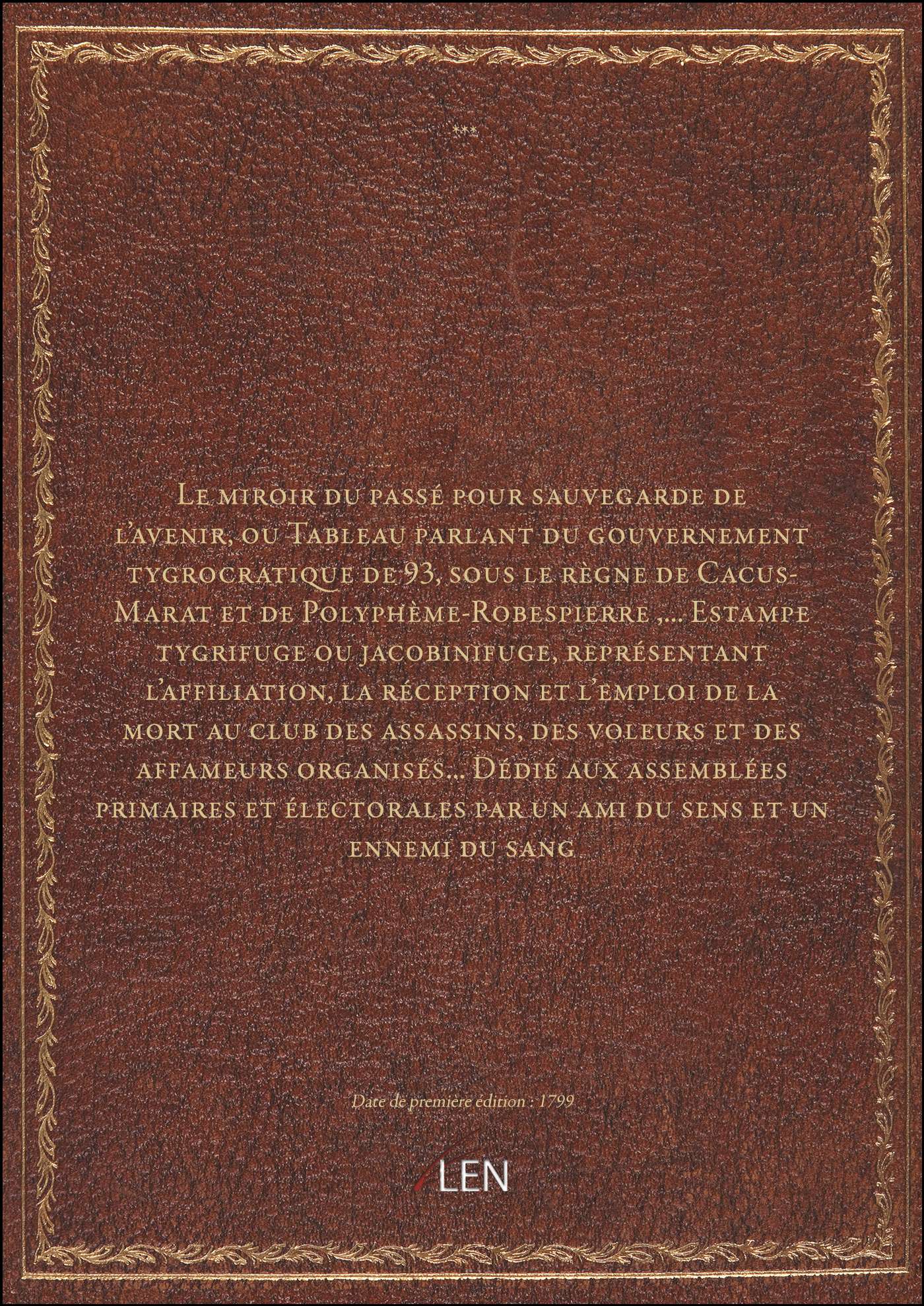 Titre complet : Le miroir du passé pour sauvegarde de l'avenir, ou Tableau parlant du gouvernement tygrocratique de 93, sous le règne de Cacus-Marat et de Polyphème-Robespierre ,... Estampe tygrifuge ou jacobinifuge, représentant l'affiliation, la réception et l'emploi de la mort au club des assassins, des voleurs et des affameurs organisés... Dédié aux assemblées primaires et électorales par un ami du sens et un ennemi du sang