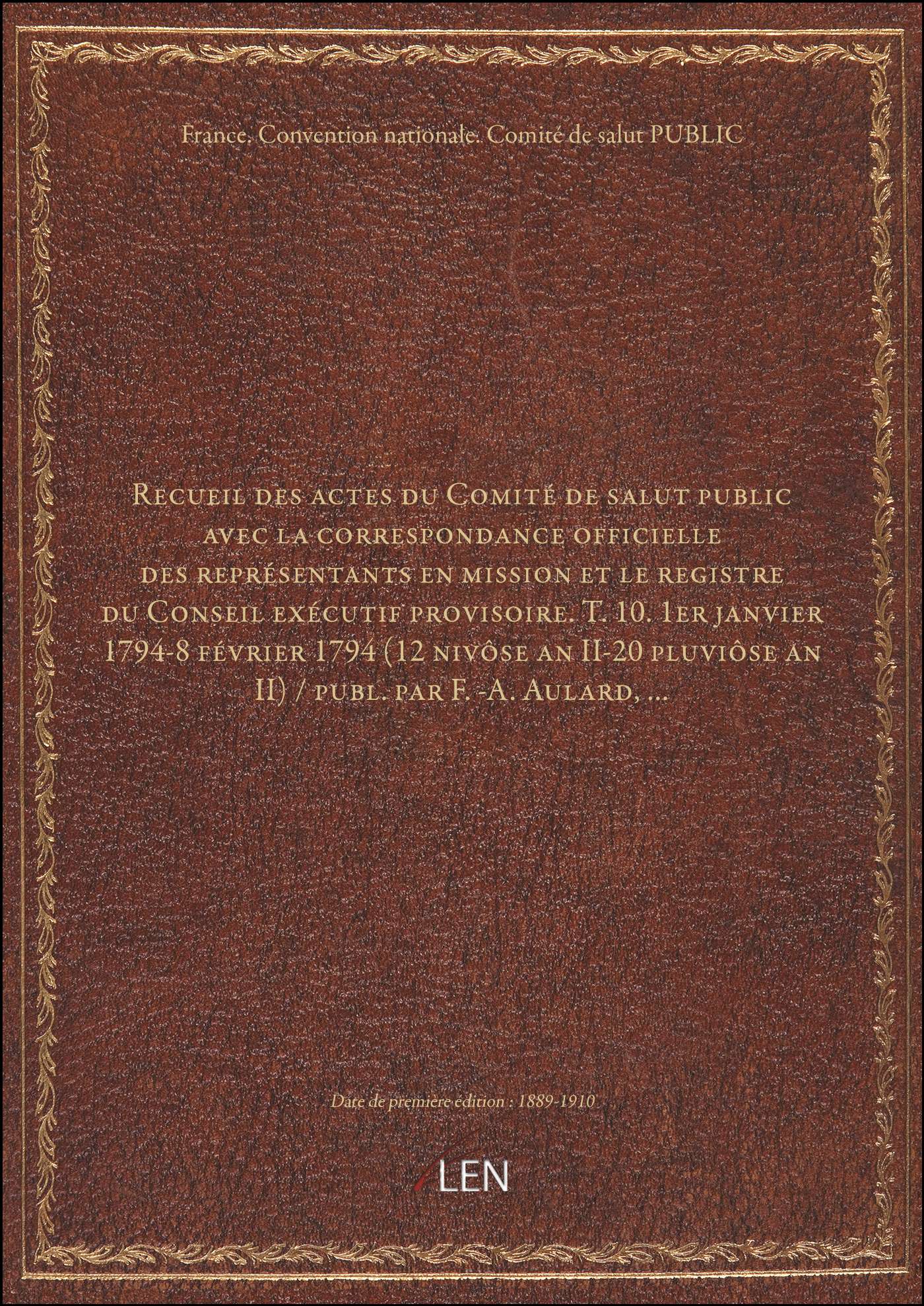 Titre complet : Recueil des actes du Comité de salut public avec la correspondance officielle des représentants en mission et le registre du Conseil exécutif provisoire. T. 10. 1er janvier 1794-8 février 1794 (12 nivôse an II-20 pluviôse an II) / publ. par F.-A. Aulard,...