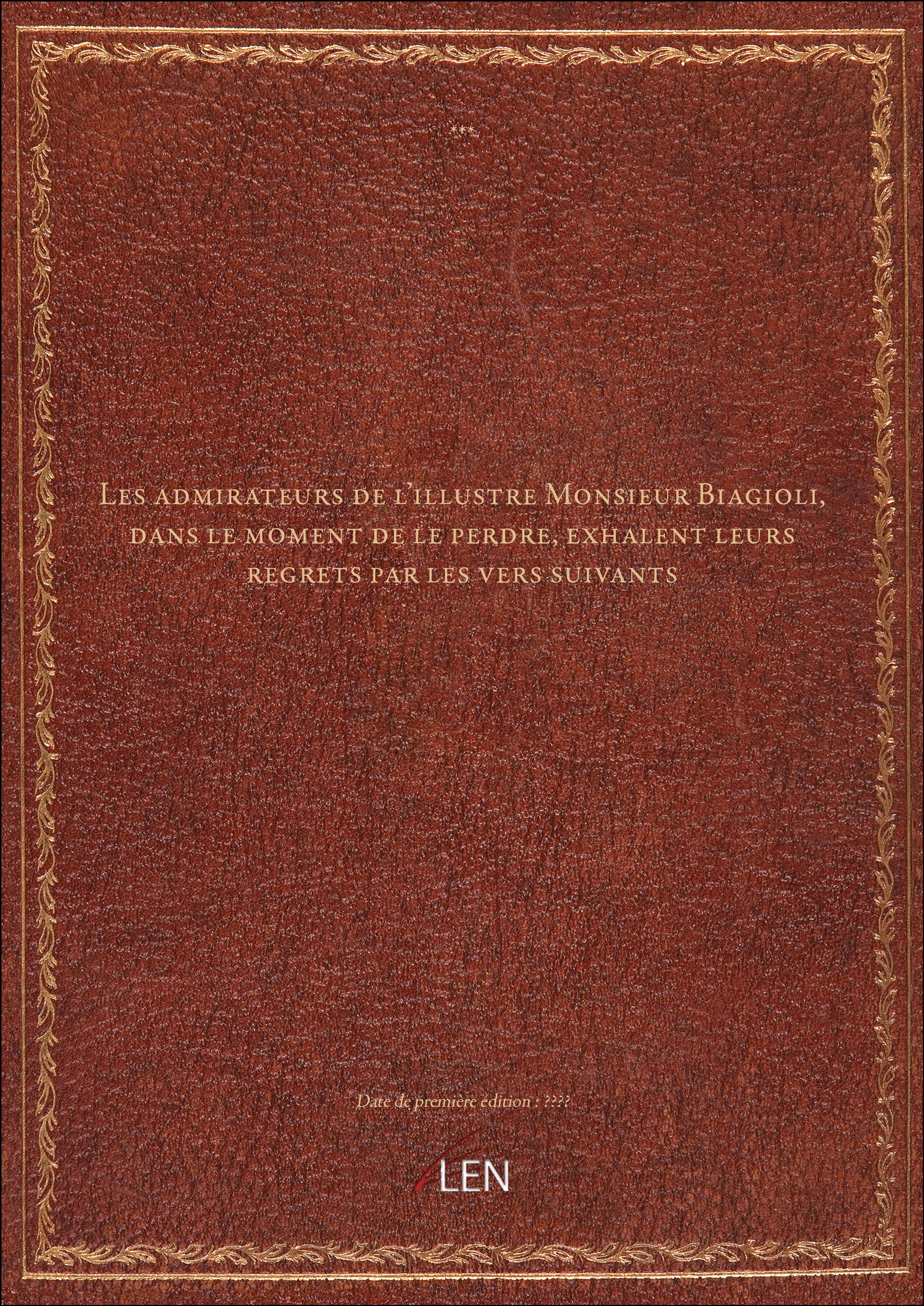 Titre complet : Les admirateurs de l'illustre Monsieur Biagioli, dans le moment de le perdre, exhalent leurs regrets par les vers suivants