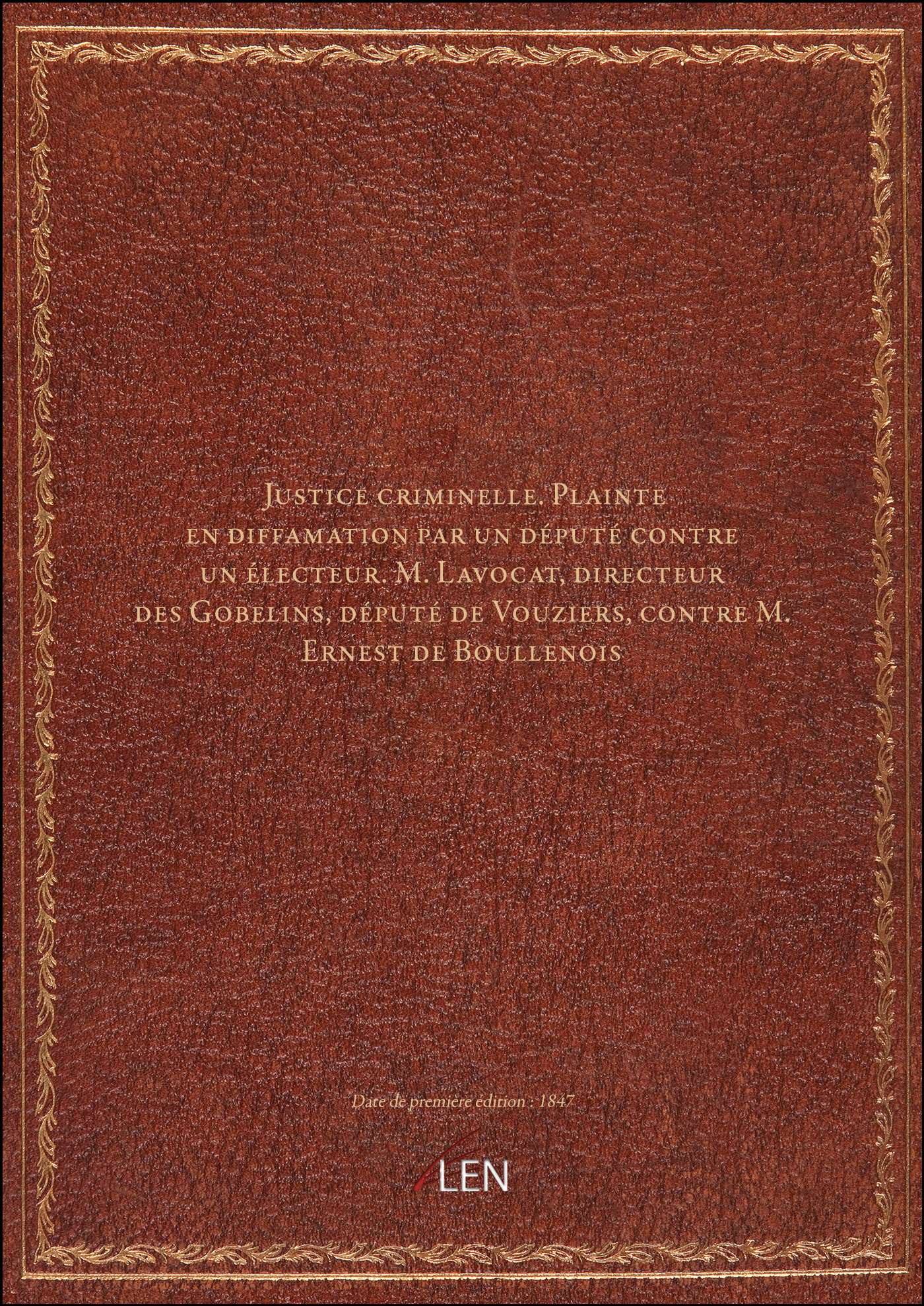 Titre complet : Justice criminelle. Plainte en diffamation par un député contre un électeur. M. Lavocat, directeur des Gobelins, député de Vouziers, contre M. Ernest de Boullenois