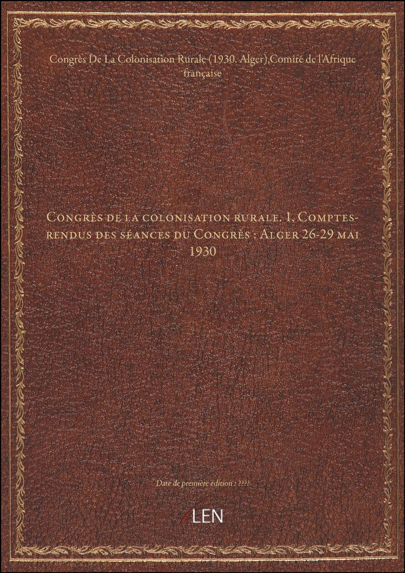 Congrès de la colonisation rurale. 1, Comptes-rendus des séances du Congrès : Alger 26-29 mai 1930 / [organisé par le] Comité de l'Afrique française