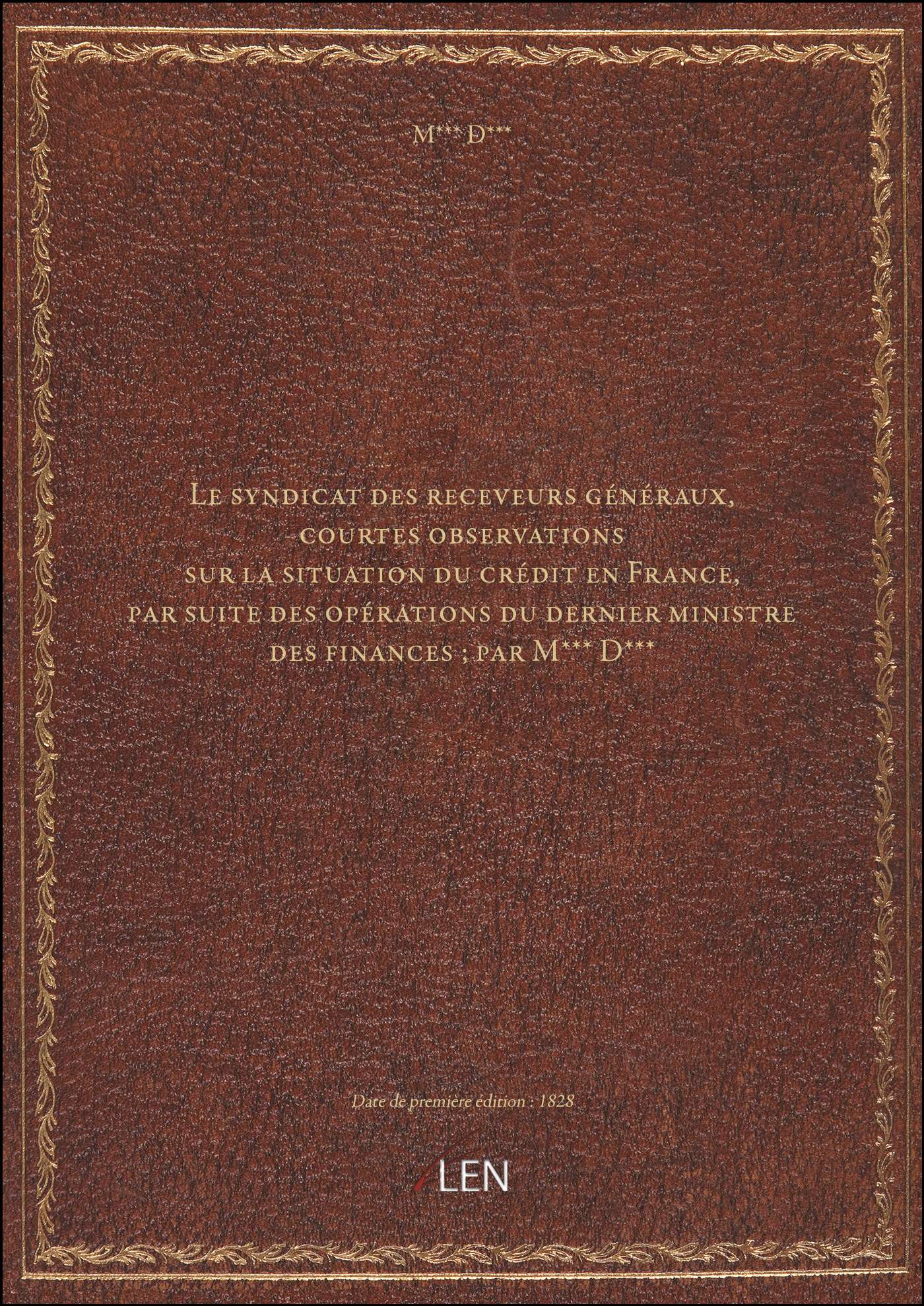 Titre complet : Le syndicat des receveurs généraux, courtes observations sur la situation du crédit en France, par suite des opérations du dernier ministre des finances ; par M*** D***