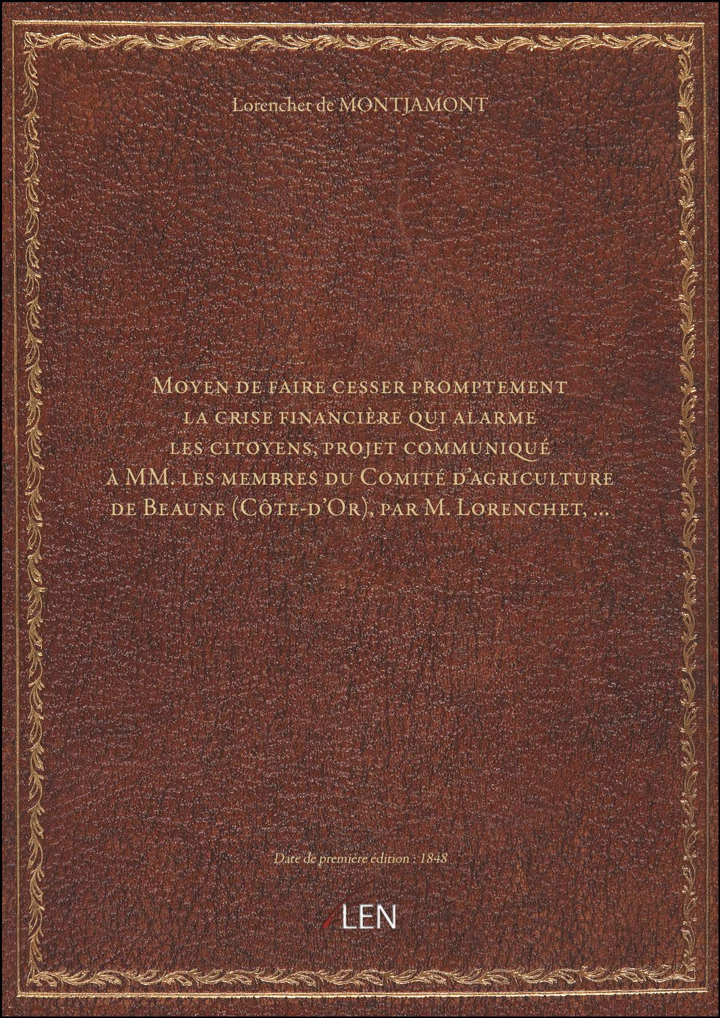 Titre complet : Moyen de faire cesser promptement la crise financière qui alarme les citoyens, projet communiqué à MM. les membres du Comité d'agriculture de Beaune (Côte-d'Or), par M. Lorenchet,...