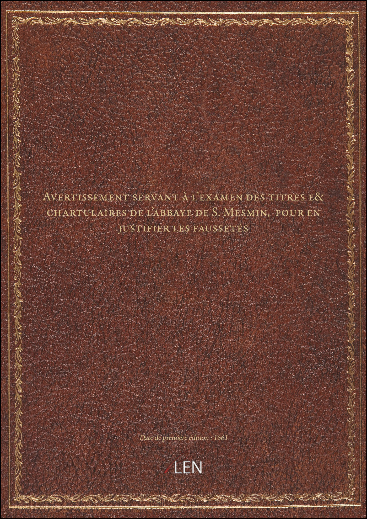 Titre complet : Avertissement servant à l'examen des titres e& chartulaires de l'abbaye de S. Mesmin, pour en justifier les faussetés