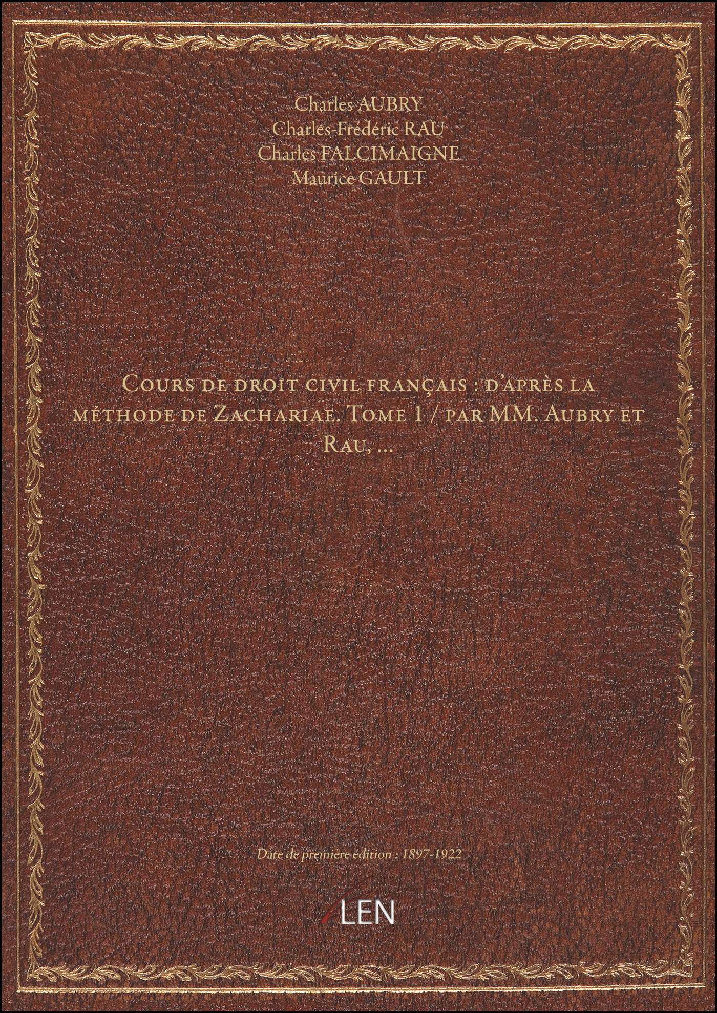 Titre complet : Cours de droit civil français : d'après la méthode de Zachariae. Tome 1 / par MM. Aubry et Rau,...