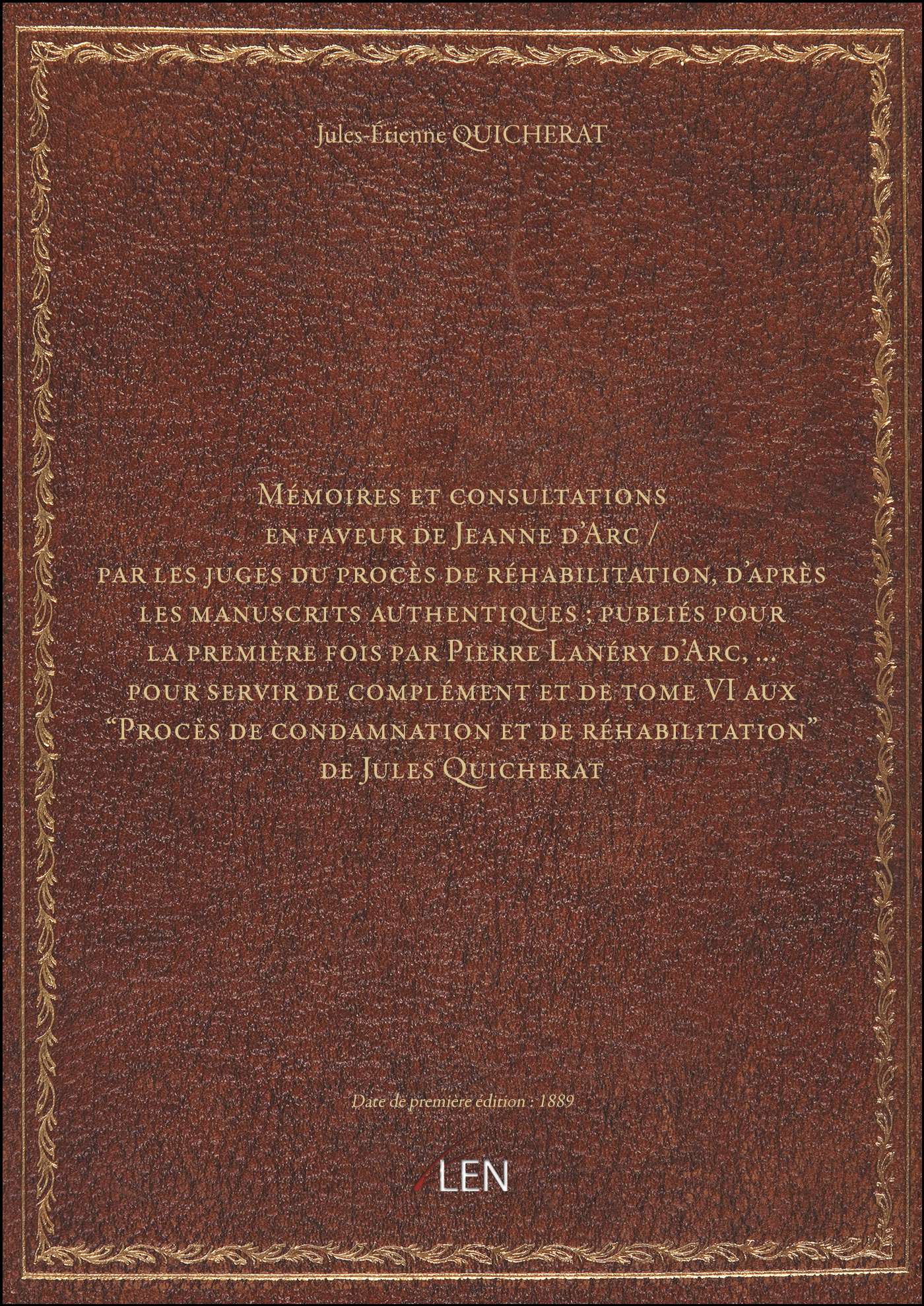 Titre complet : Mémoires et consultations en faveur de Jeanne d'Arc / par les juges du procès de réhabilitation, d'après les manuscrits authentiques ; publiés pour la première fois par Pierre Lanéry d'Arc,... pour servir de complément et de tome VI aux "Procès de condamnation et de réhabilitation" de Jules Quicherat