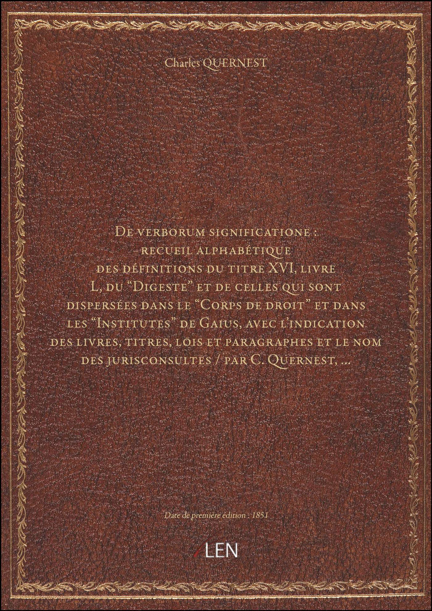 Titre complet : De verborum significatione : recueil alphabétique des définitions du titre XVI, livre L, du "Digeste" et de celles qui sont dispersées dans le "Corps de droit" et dans les "Institutes" de Gaius, avec l'indication des livres, titres, lois et paragraphes et le nom des jurisconsultes / par C. Quernest,...