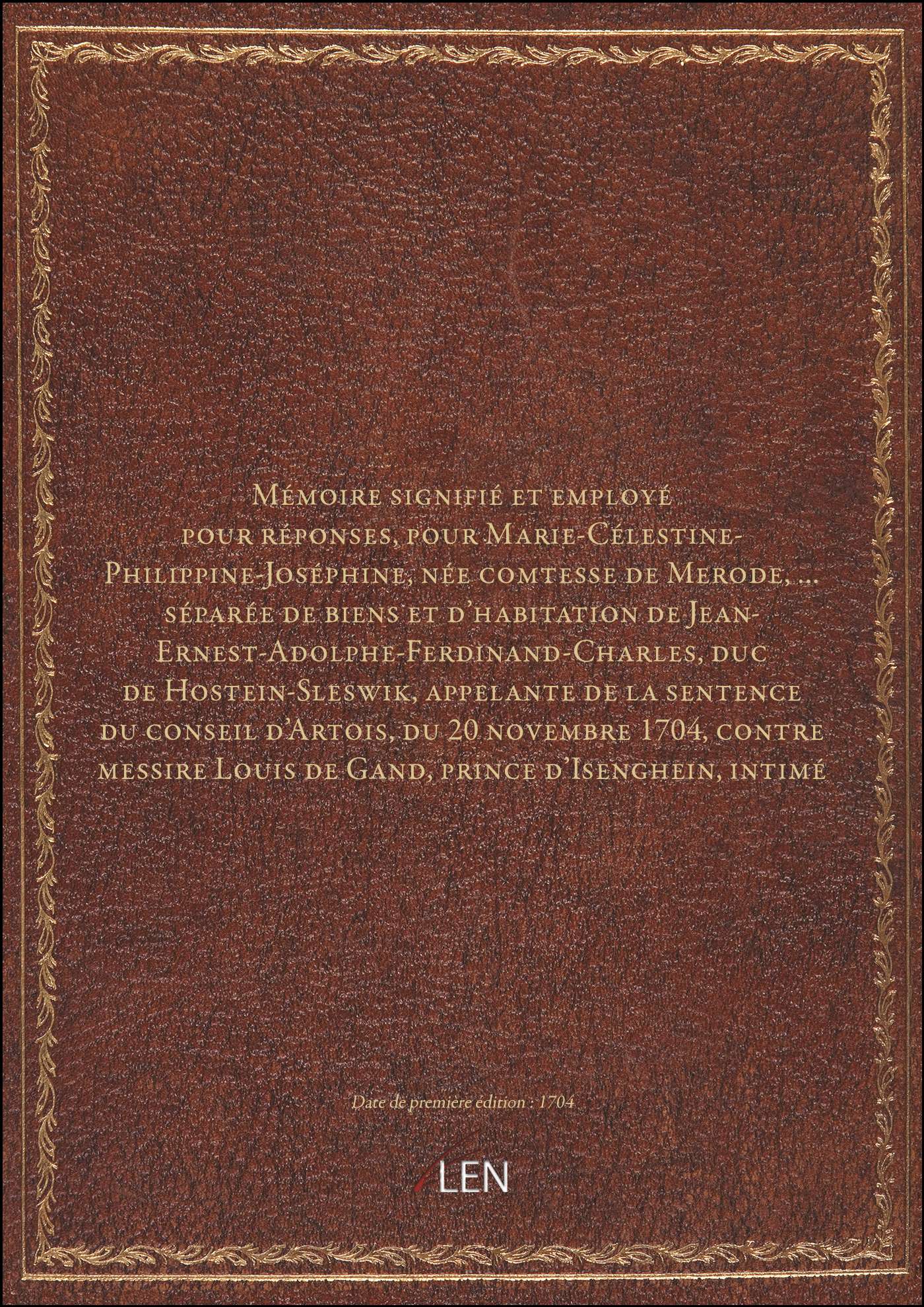 Titre complet : Mémoire signifié et employé pour réponses, pour Marie-Célestine-Philippine-Joséphine, née comtesse de Merode,... séparée de biens et d'habitation de Jean-Ernest-Adolphe-Ferdinand-Charles, duc de Hostein-Sleswik, appelante de la sentence du conseil d'Artois, du 20 novembre 1704, contre messire Louis de Gand, prince d'Isenghein, intimé