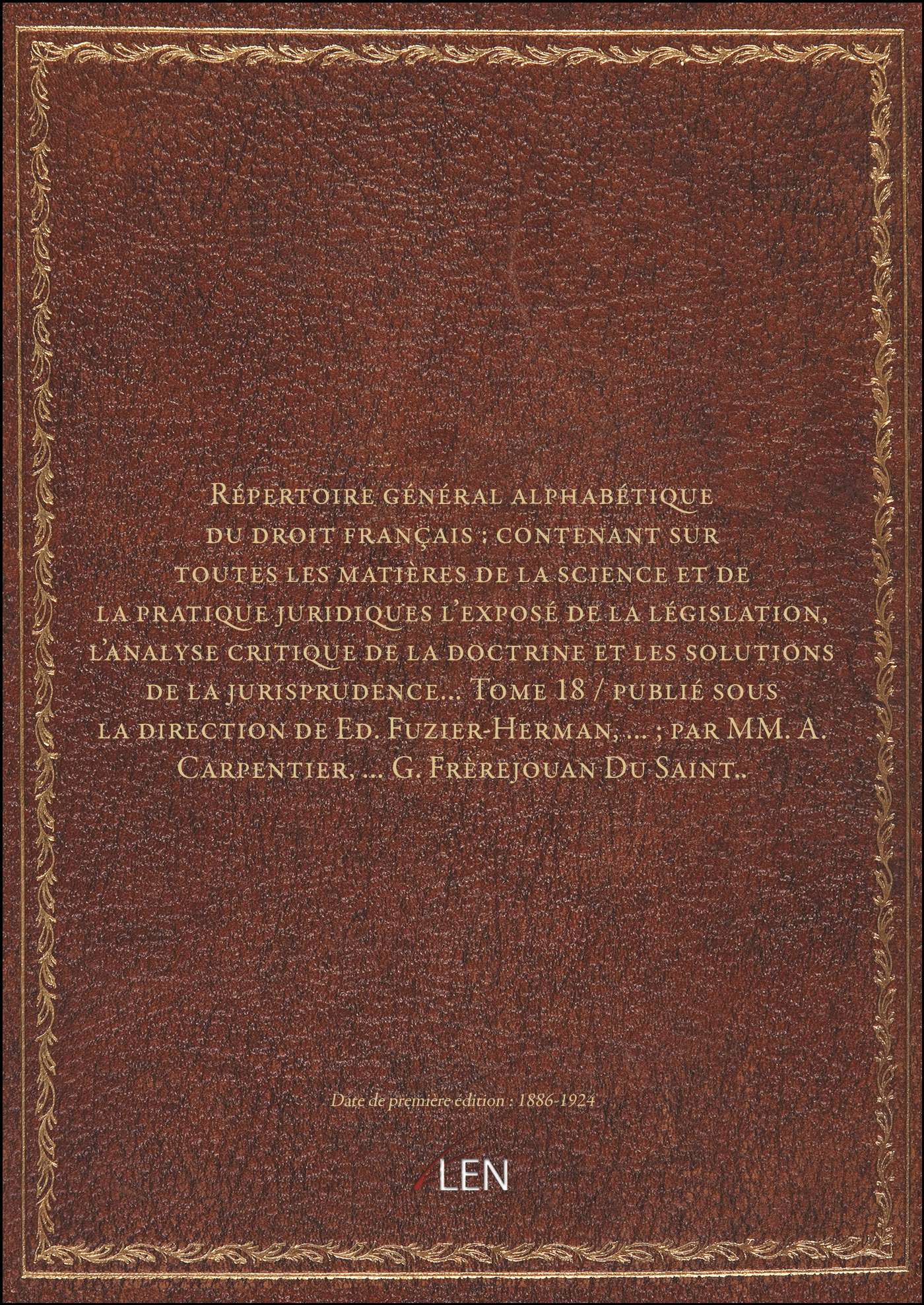 Titre complet : Répertoire général alphabétique du droit français : contenant sur toutes les matières de la science et de la pratique juridiques l'exposé de la législation, l'analyse critique de la doctrine et les solutions de la jurisprudence.... Tome 18 / publié sous la direction de Ed. Fuzier-Herman,... ; par MM. A. Carpentier,... G. Frèrejouan Du Saint..