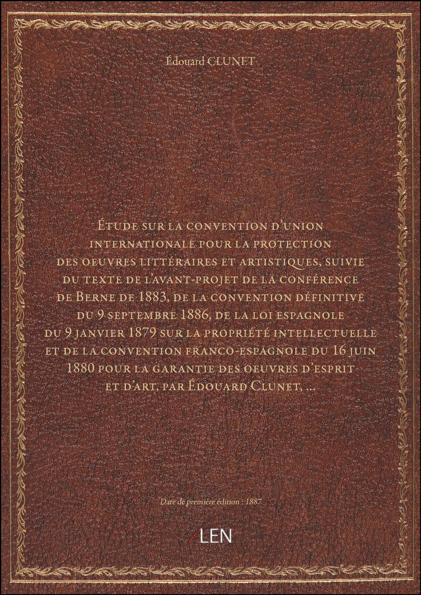 Titre complet : Étude sur la convention d'union internationale pour la protection des oeuvres littéraires et artistiques, suivie du texte de l'avant-projet de la conférence de Berne de 1883, de la convention définitive du 9 septembre 1886, de la loi espagnole du 9 janvier 1879 sur la propriété intellectuelle et de la convention franco-espagnole du 16 juin 1880 pour la garantie des oeuvres d'esprit et d'art, par Édouard Clunet,...