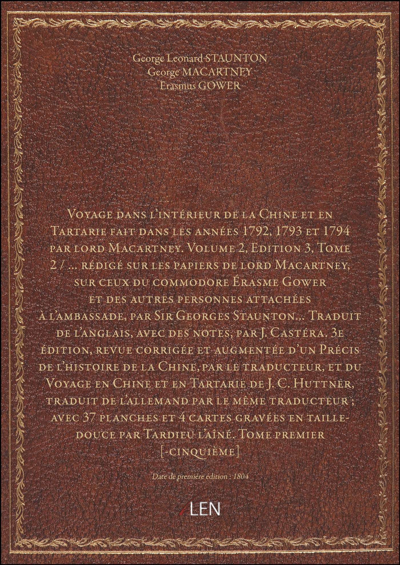 Titre complet : Voyage dans l'intérieur de la Chine et en Tartarie fait dans les années 1792, 1793 et 1794 par lord Macartney. Volume 2,Edition 3,Tome 2 / ... rédigé sur les papiers de lord Macartney, sur ceux du commodore Érasme Gower et des autres personnes attachées à l'ambassade, par Sir Georges Staunton... Traduit de l'anglais, avec des notes, par J. Castéra. 3e édition, revue corrigée et augmentée d'un Précis de l'histoire de la Chine, par le traducteur, et du Voyage en Chine et en Tartarie de J. C. Huttner, traduit de l'allemand par le même traducteur ; avec 37 planches et 4 cartes gravées en taille-douce par Tardieu l'aîné. Tome premier [-cinquième]
