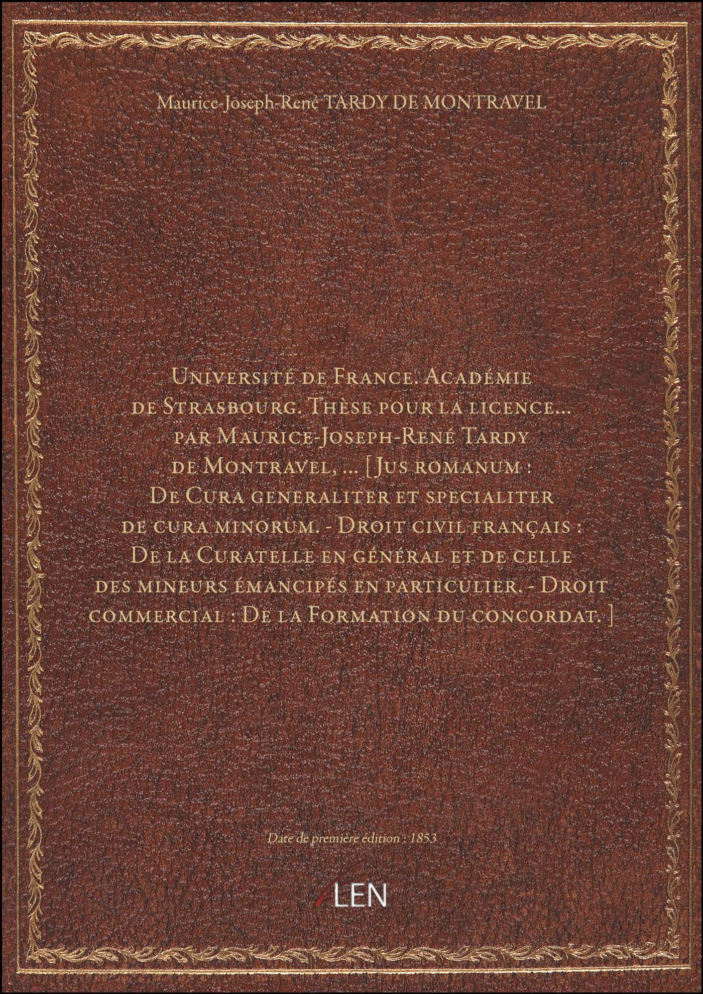 Université de France. Académie de Strasbourg. Thèse pour la licence... par Maurice-Joseph-René Tardy de Montravel, ... [Jus romanum : De Cura generaliter et specialiter de cura minorum. - Droit civil français : De la Curatelle en général et de celle [...]