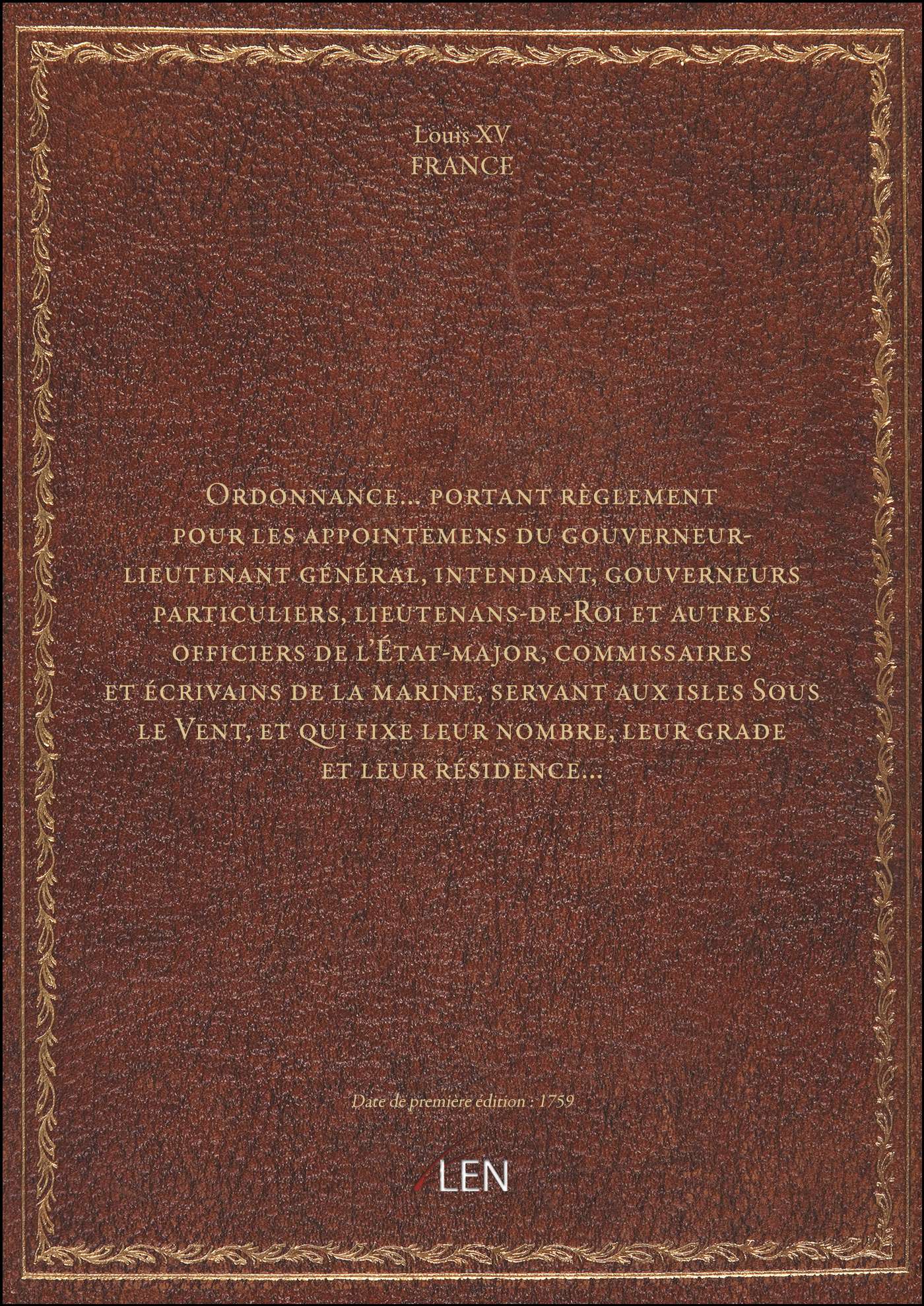 Titre complet : Ordonnance... portant règlement pour les appointemens du gouverneur-lieutenant général, intendant, gouverneurs particuliers, lieutenans-de-Roi et autres officiers de l'État-major, commissaires et écrivains de la marine, servant aux isles Sous le Vent, et qui fixe leur nombre, leur grade et leur résidence...