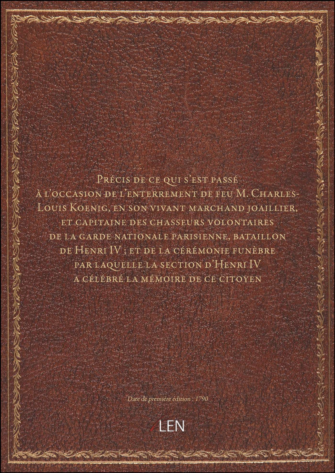 Titre complet : Précis de ce qui s'est passé à l'occasion de l'enterrement de feu M. Charles-Louis Koenig, en son vivant marchand joaillier, et capitaine des chasseurs volontaires de la garde nationale parisienne, bataillon de Henri IV ; et de la cérémonie funèbre par laquelle la section d'Henri IV a célébré la mémoire de ce citoyen