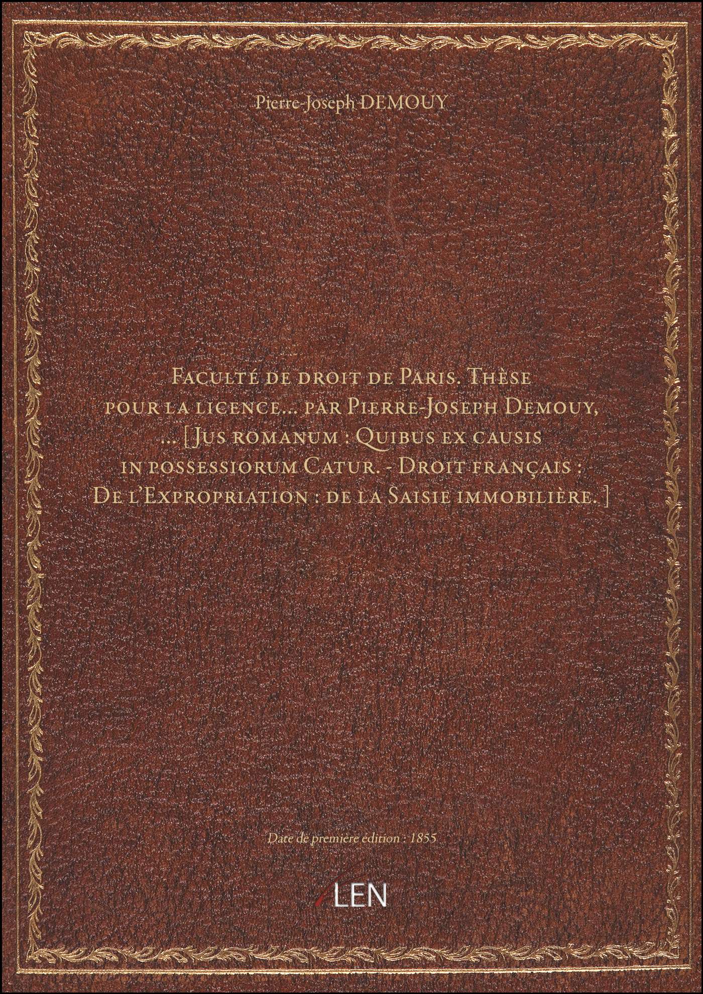 Titre complet : Faculté de droit de Paris. Thèse pour la licence... par Pierre-Joseph Demouy, ... [Jus romanum : Quibus ex causis in possessiorum Catur. - Droit français : De l'Expropriation : de la Saisie immobilière.]
