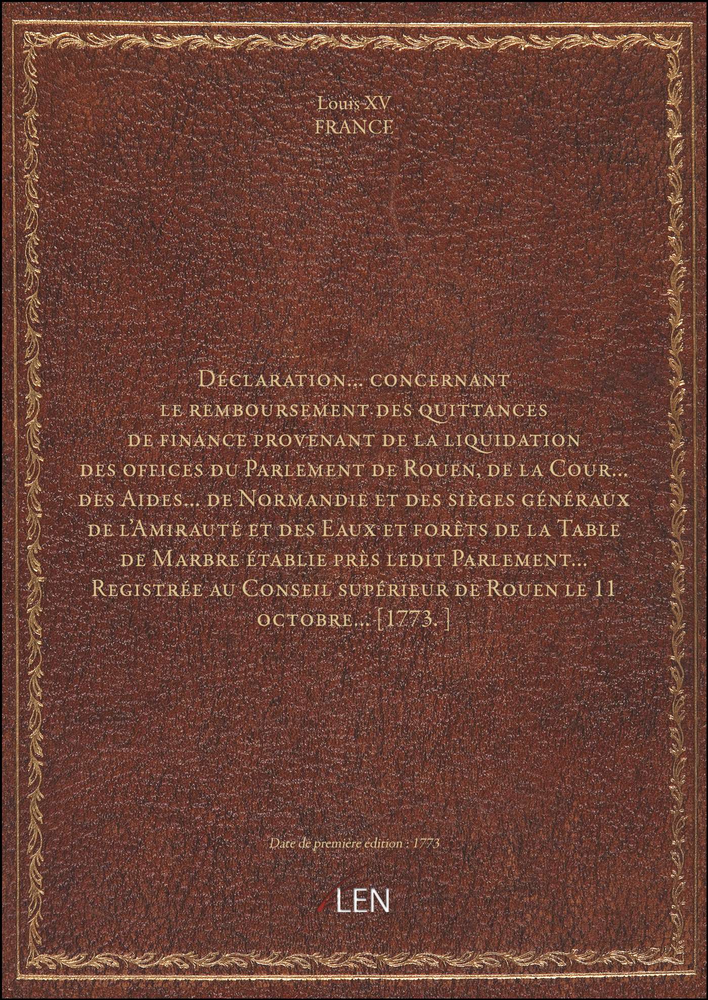 Titre complet : Déclaration... concernant le remboursement des quittances de finance provenant de la liquidation des offices du Parlement de Rouen, de la Cour... des Aides... de Normandie et des sièges généraux de l'Amirauté et des Eaux et forêts de la Table de Marbre établie près ledit Parlement... Registrée au Conseil supérieur de Rouen le 11 octobre... [1773.]