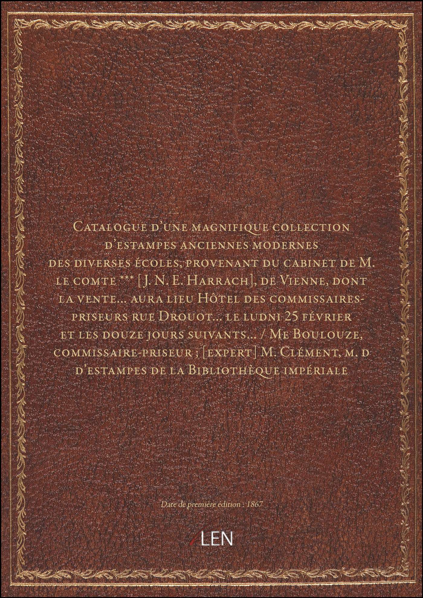 Titre complet : Catalogue d'une magnifique collection d'estampes anciennes modernes des diverses écoles, provenant du cabinet de M. le comte *** [J. N. E. Harrach], de Vienne, dont la vente... aura lieu Hôtel des commissaires-priseurs rue Drouot... le ludni 25 février et les douze jours suivants... / Me Boulouze, commissaire-priseur ; [expert] M. Clément, m.d d'estampes de la Bibliothèque impériale